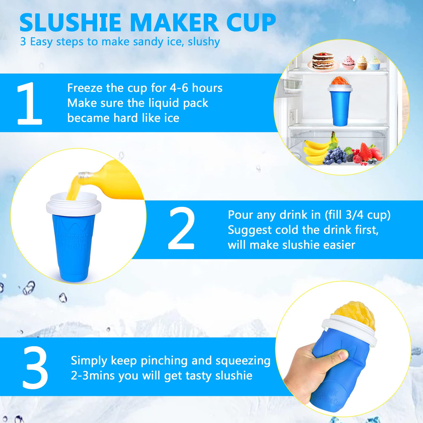 - Q: What materials are used to make the slushy cup? A: The slushy cup is made from food-grade materials including silicone, EVA, and polypropylene (PP), ensuring safety and durability for making smoothies and slushies.