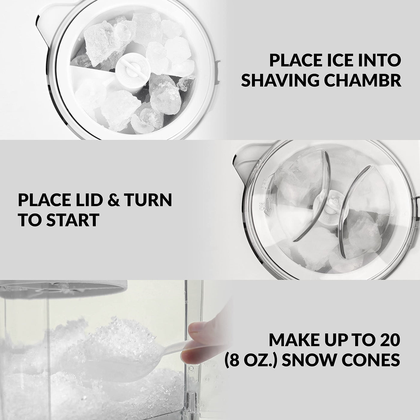 • Q: What are the dimensions of the machine? A: The machine is compact and designed to fit on kitchen countertops or small side tables, making it convenient for serving snow cones.