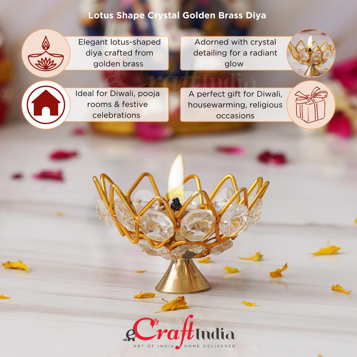 eCraftIndia Lotus Shape Crystal Golden Brass Diya for Diwali, Navratri, Dussehra, and Other Festive Occasions
