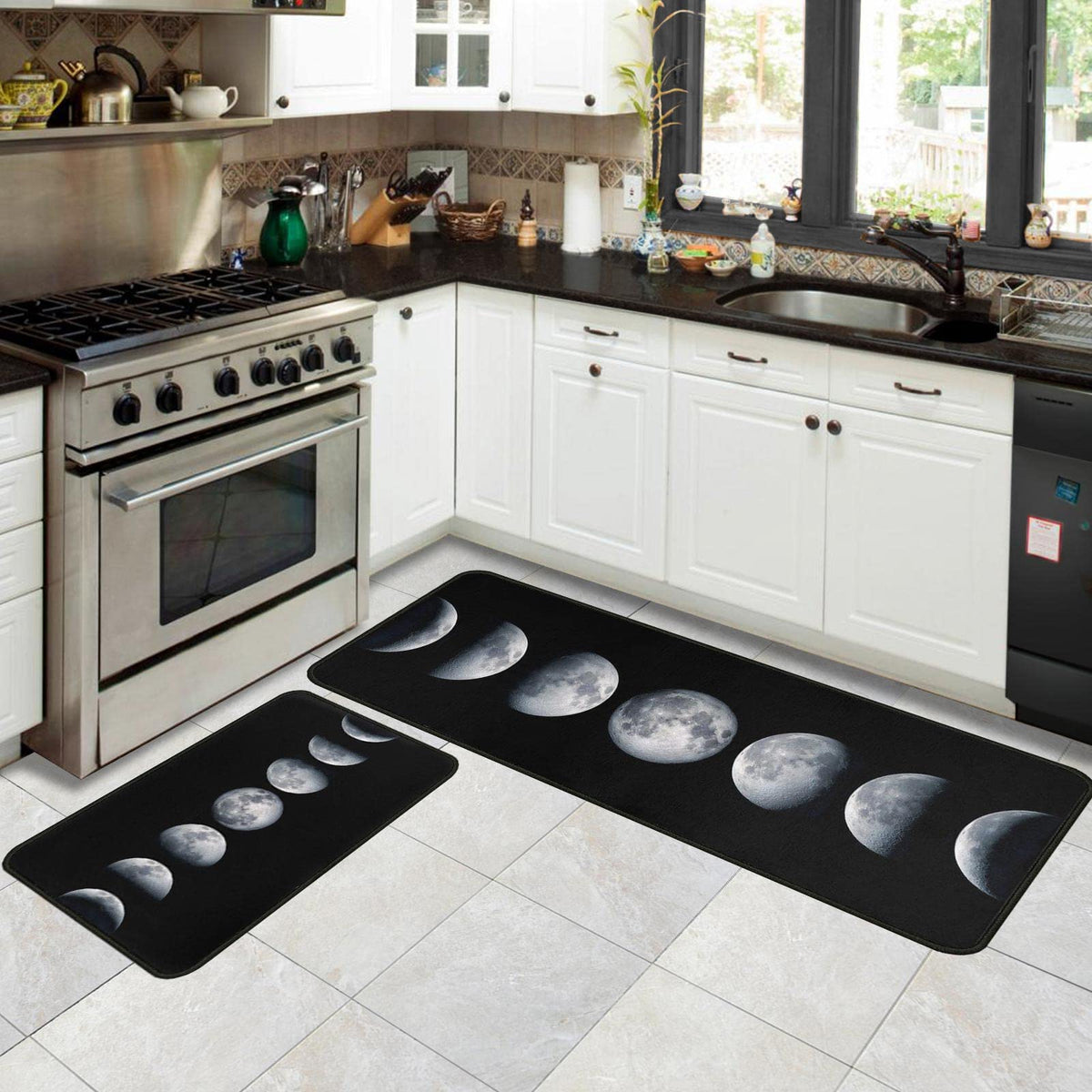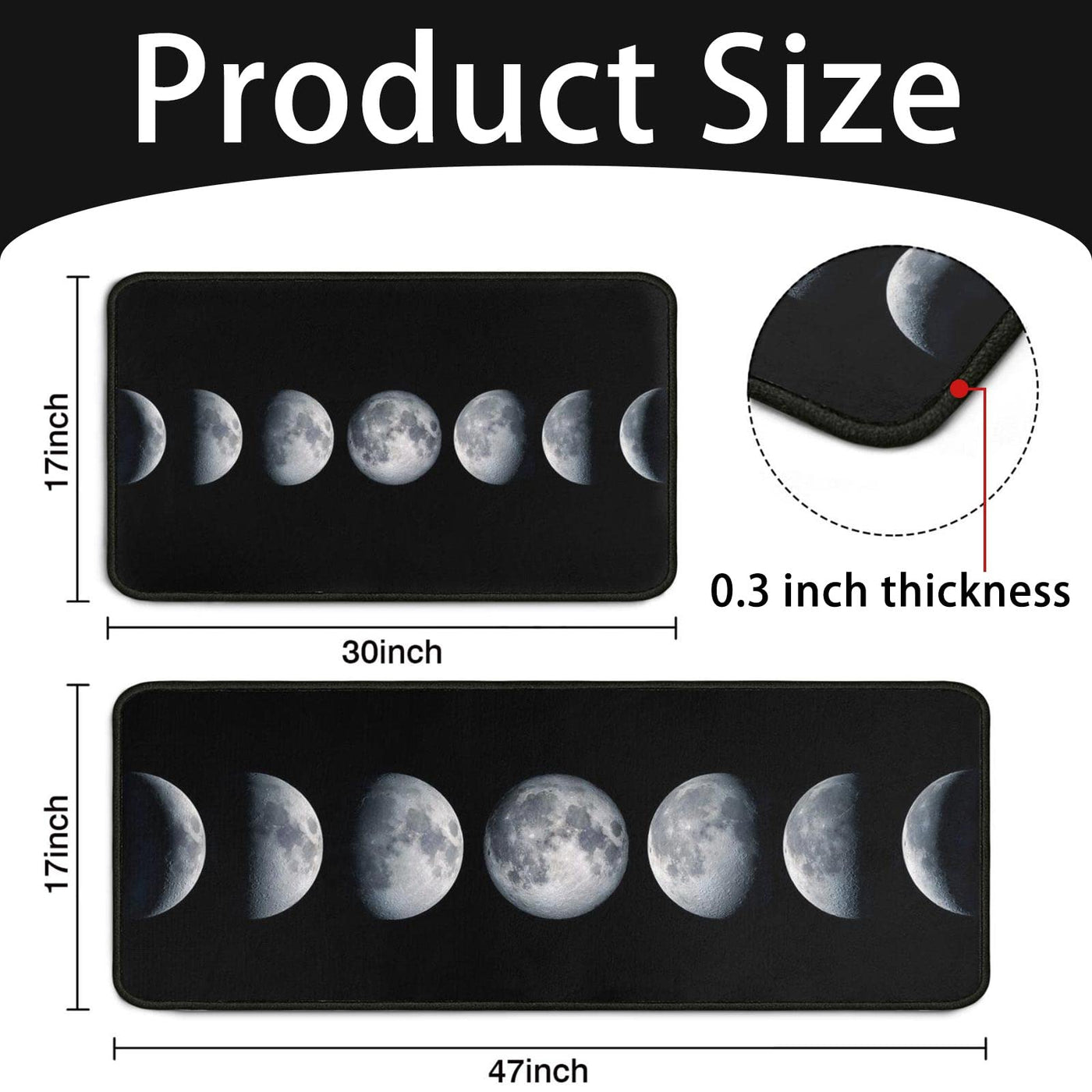 - Q: What are the dimensions of the Moon Kitchen Rugs Set? A: The Moon Kitchen Rugs Set includes two pieces with dimensions of 17 inches by 47 inches and 17 inches by 30 inches.