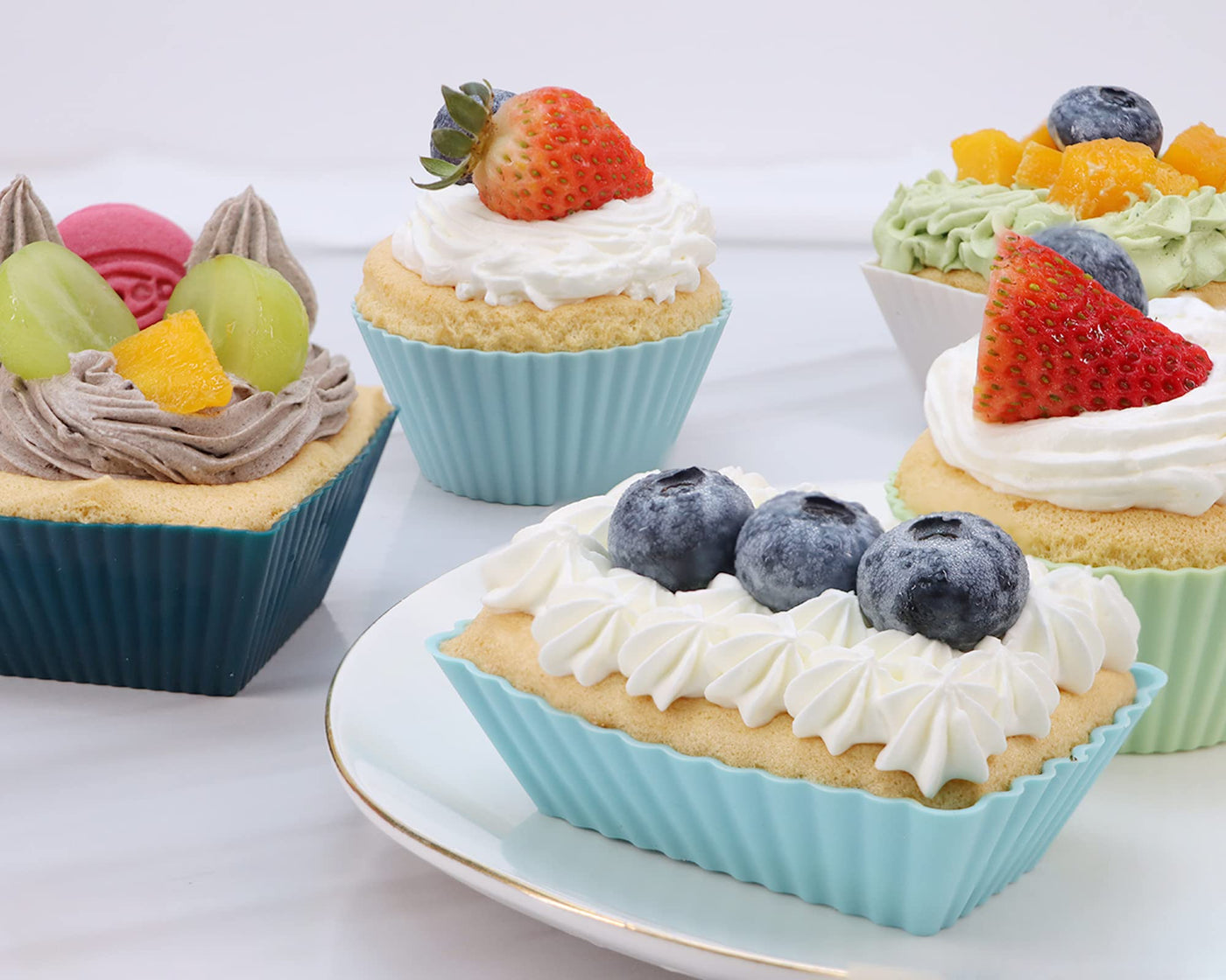 • Q: What material are the silicone muffin cups made from? A: The silicone muffin cups are made from food grade silicone, ensuring they are safe for use in baking and food preparation.