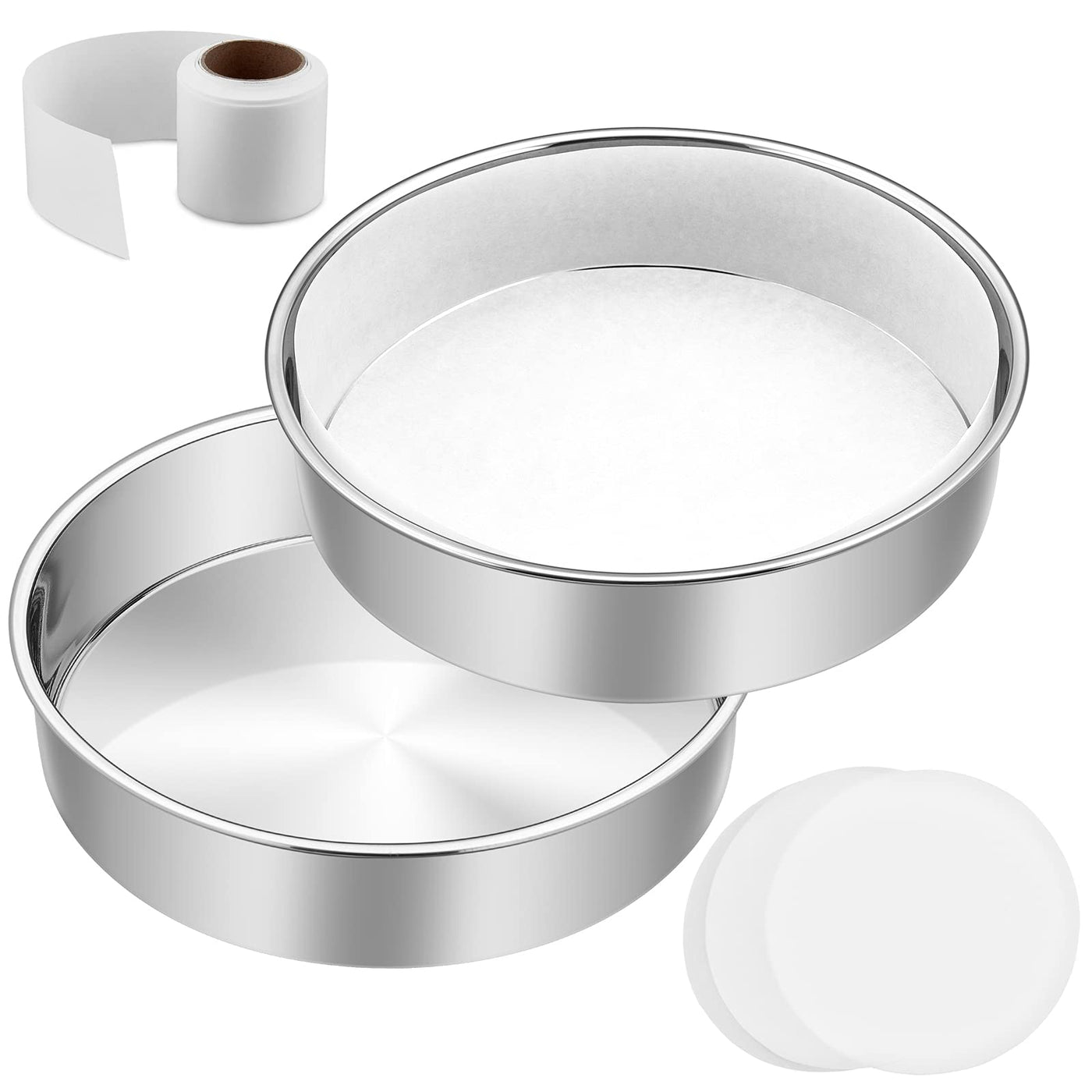8 Inch Cake Pan Set Of 2, E-Far Stainless Steel Round Layer Cake Baking Pans With Parchment Rounds & Side Liner Roll, Non-Toxic