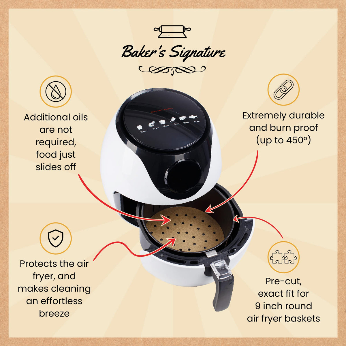 • Q: What are Baker's Signature Parchment Paper Airfryer Liners made from? A: Baker's Signature Parchment Paper Airfryer Liners are made from 100% natural wood pulp and feature a non-toxic silicone coating, making them eco-friendly and unbleached.