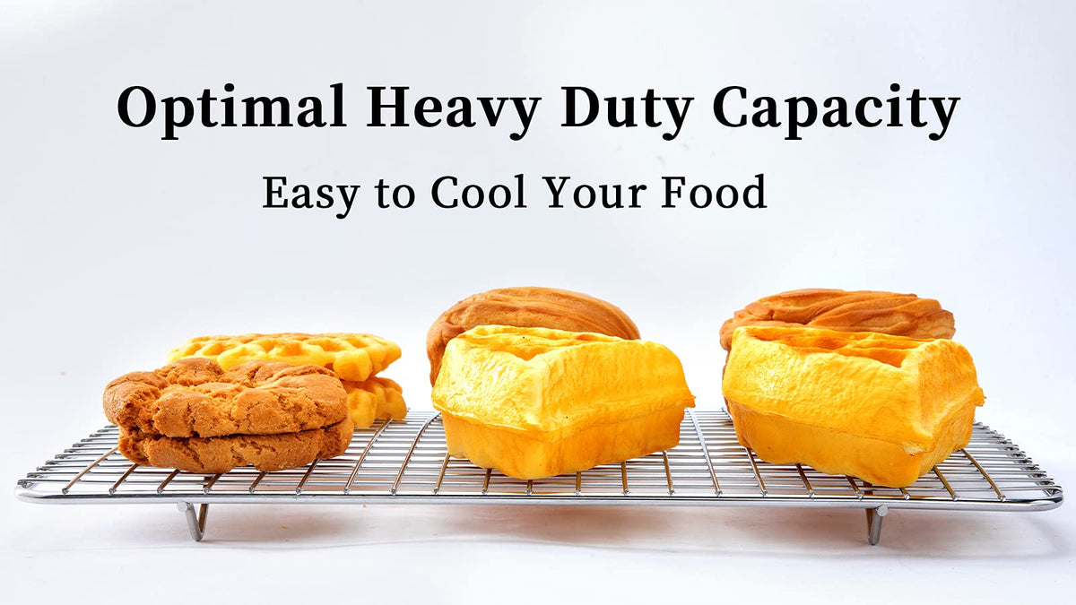 • Q: How does the cooling design prevent food from falling through? A: The bold grid wire design of the Aisoso Cooling Rack maximizes contact with air while preventing treats from falling through the grid.
