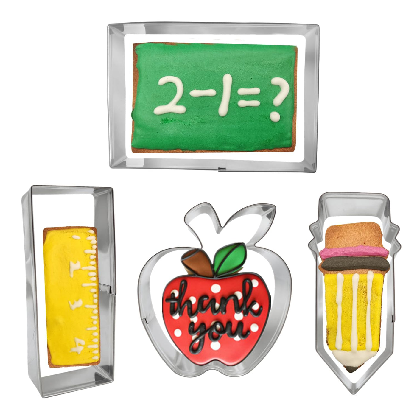 • Q: What shapes are included in the Back to School Cookie Cutters Set? A: The set includes four themed shapes: an apple cutter, a pencil cutter, a ruler cutter, and a chalkboard cutter.