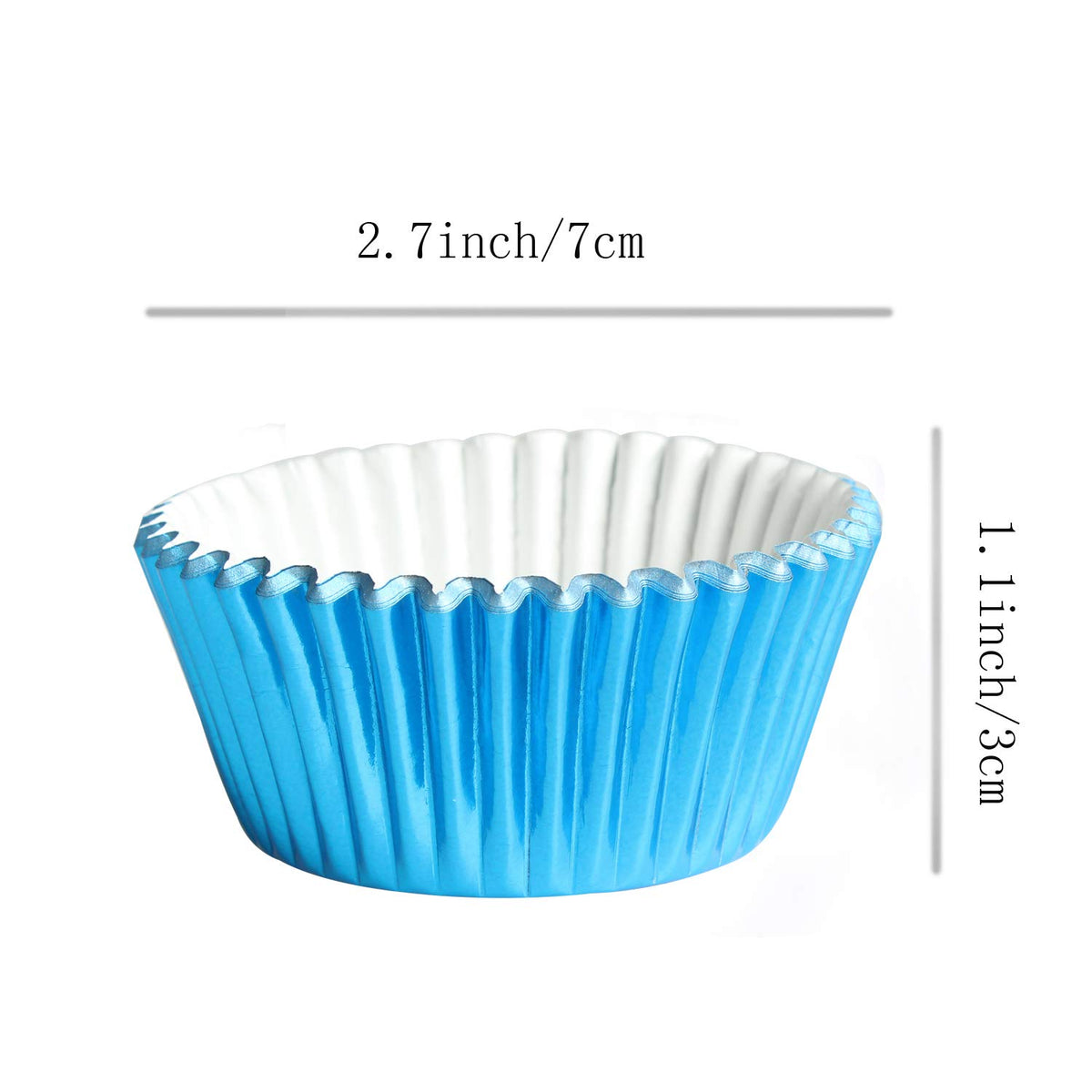- Q: What are the dimensions of the Blue-Foil Cupcake Liners? A: The cupcake liners are 3 centimeters high and 7 centimeters wide, which is approximately 1.1 inches high and 2.7 inches wide.