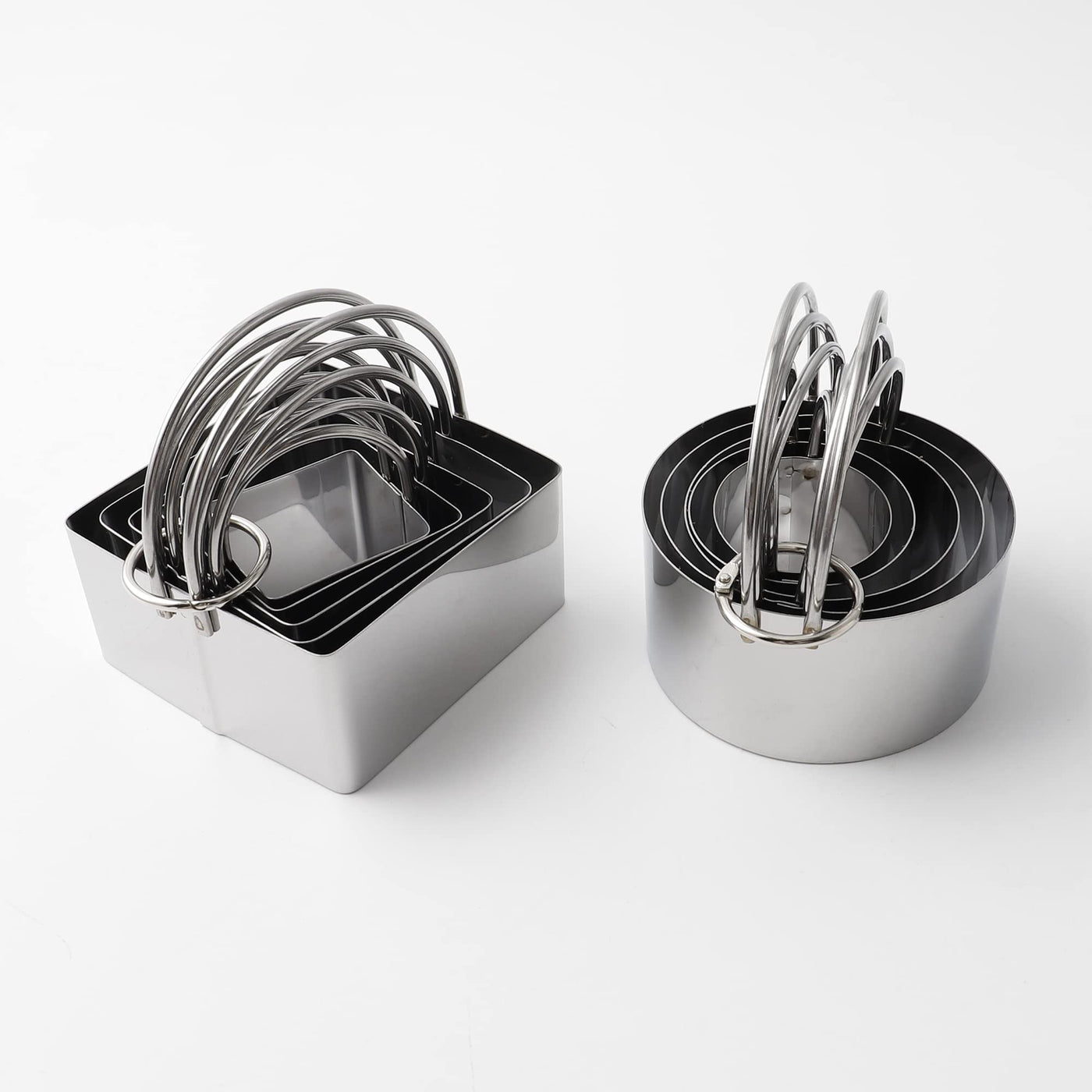 - Q: What sizes are included in the Cookie Cutters Set? A: The Cookie Cutters Set includes 5 round cutters ranging from approximately 2.4 inches (6 cm) to 4.7 inches (12 cm) in diameter, and 5 square cutters ranging from 2 inches (5 cm) to 3.1 inches (8 cm) in length.