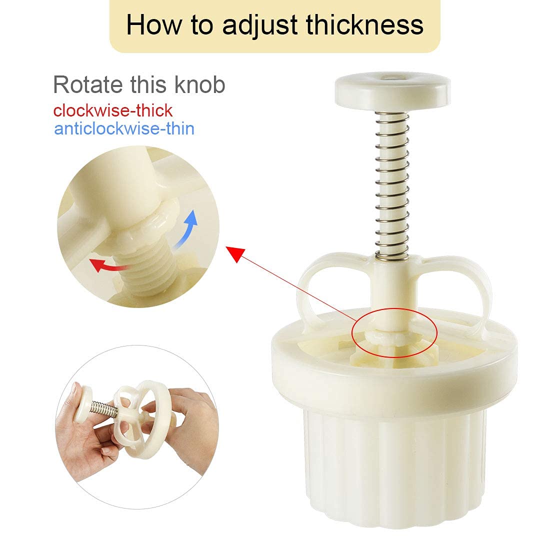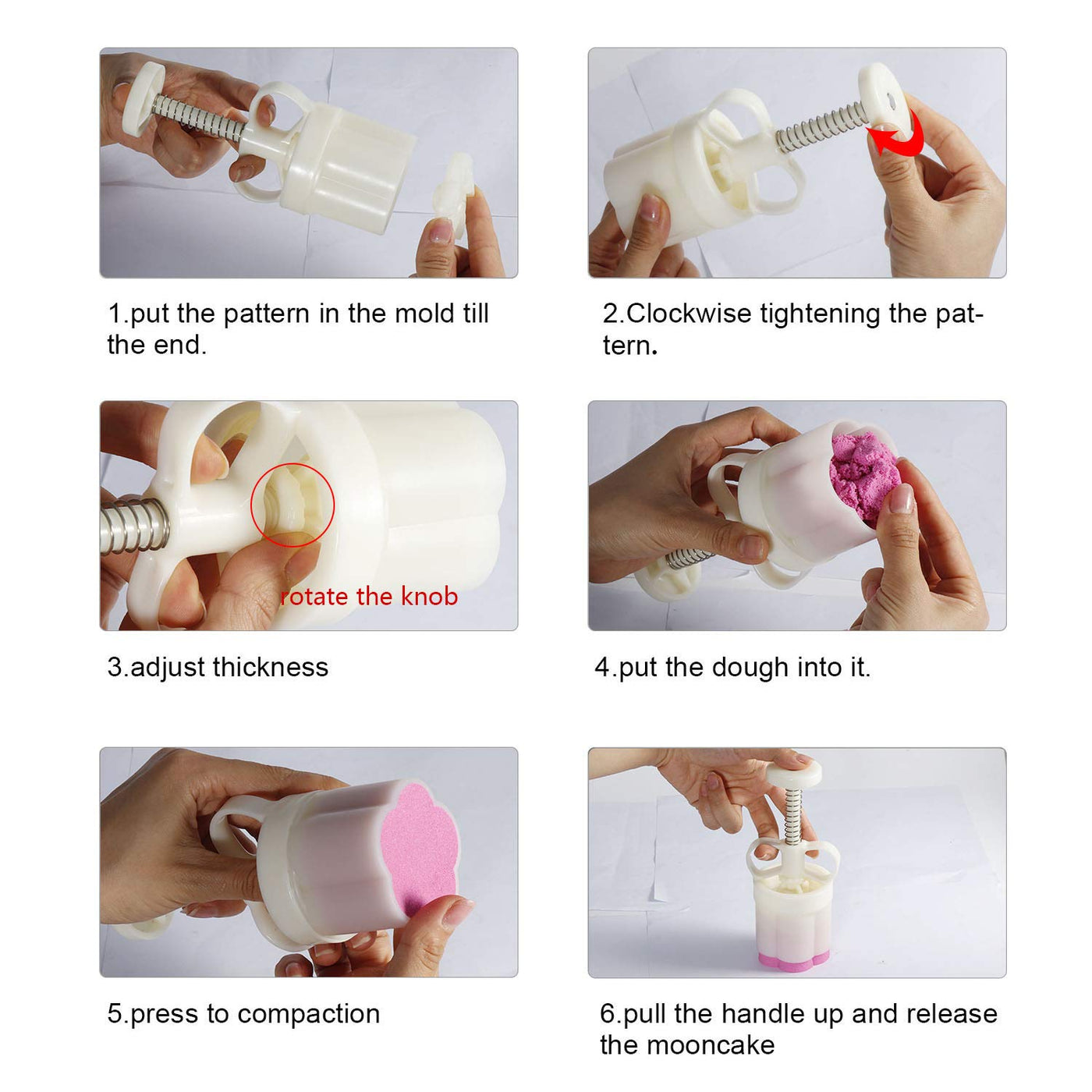 • Q: How do I adjust the thickness of the cookies or mooncakes? A: You can adjust the thickness by turning the knob on the handle of the mold to change the height for different sizes of cookies or mooncakes.