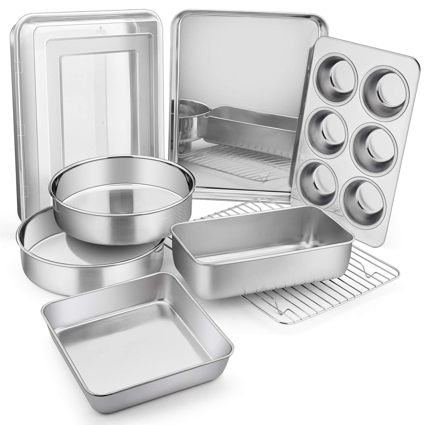 E-Far Stainless Steel Bakeware Set, Metal Baking Pan Set Of 9, Include Round/Square Cake Pans, Rectangle Baking Pan With Lid, Lo