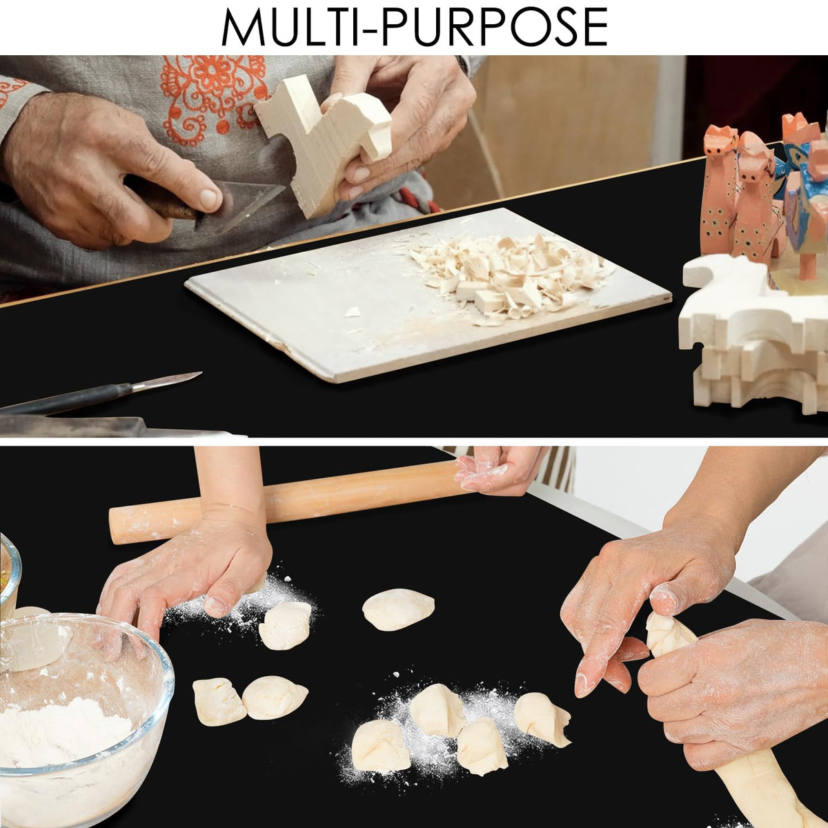- Q: Does the mat stay in place while using it? A: Yes, the mat features a non-slip design that helps it stay securely in place on countertops or tables during use.