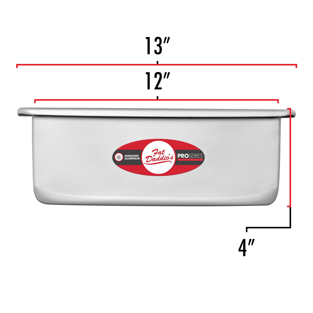 • Q: What are the dimensions of Fat Daddio's POB-12184 Anodized Aluminum Sheet Cake Pan? A: The pan measures internally 12 inches by 18 inches by 4 inches and overall 13 inches by 19 inches by 4 inches.