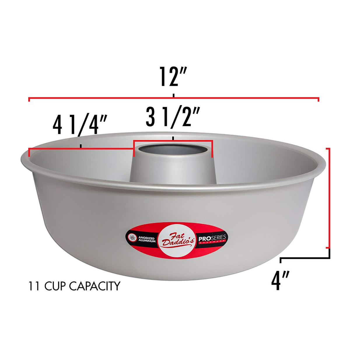 • Q: What are the dimensions of Fat Daddio’s RMP-12 Ring Mold Pan? A: The pan measures 12 inches by 4 inches, with an overall measurement of 13 inches by 4.25 inches.