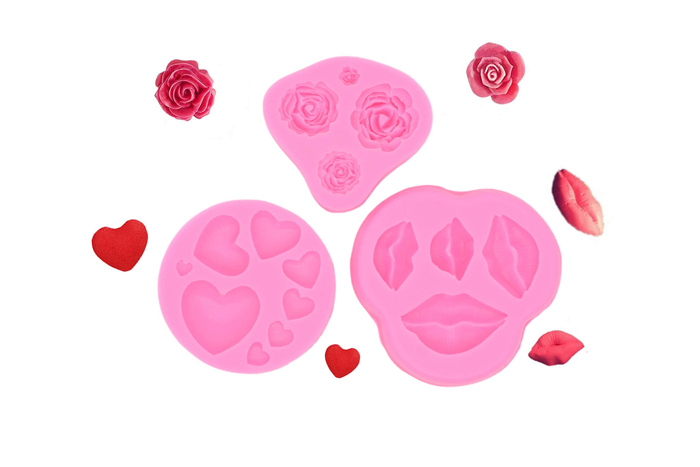 Feilibay 3 Pack Silicone Fondant Cake Molds, Rose Flower, Lips, Heart Shape Candy Molds Set For Chocolate Making, Cake, Valentin