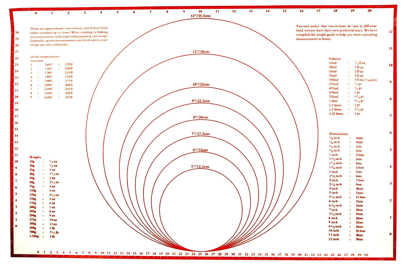 • Q: Does the baking mat provide measurement conversions? A: Yes, the mat features an extensive measurement guide including conversions for inches and centimeters, Celsius and Fahrenheit, weight in grams/kilograms and ounces/pounds, and volume in milliliters/liters and fluid ounces/pints.