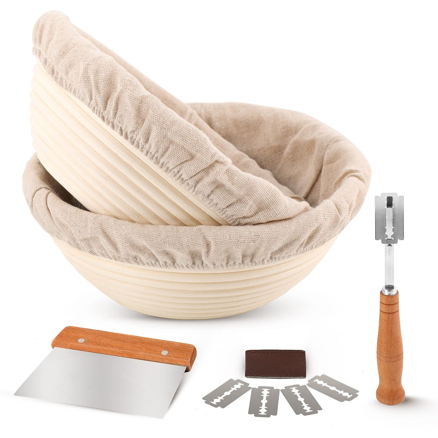- Q: What is included in the bread baking set? A: The set includes 2 sourdough proofing baskets, 2 liners, 1 scoring lame, 1 metal scraper, 4 spare blades, and a scoring lame cover.