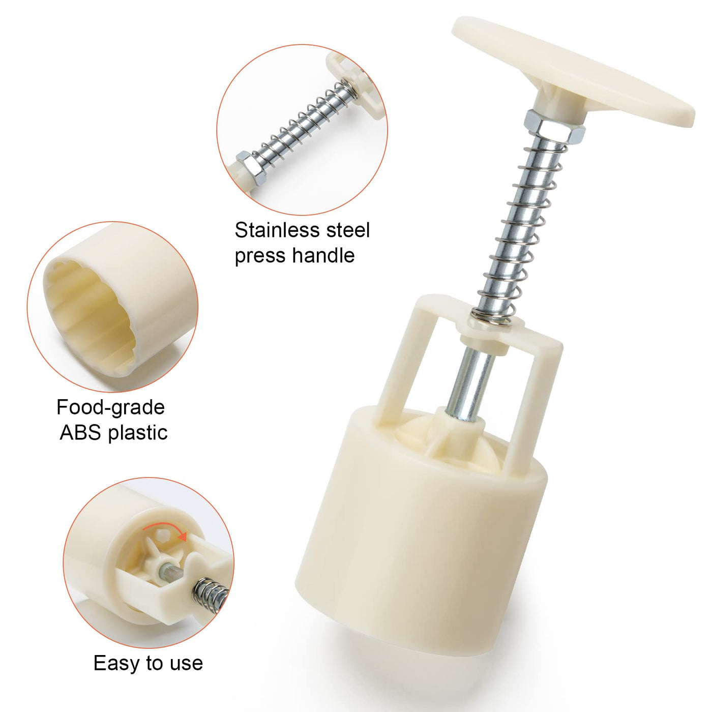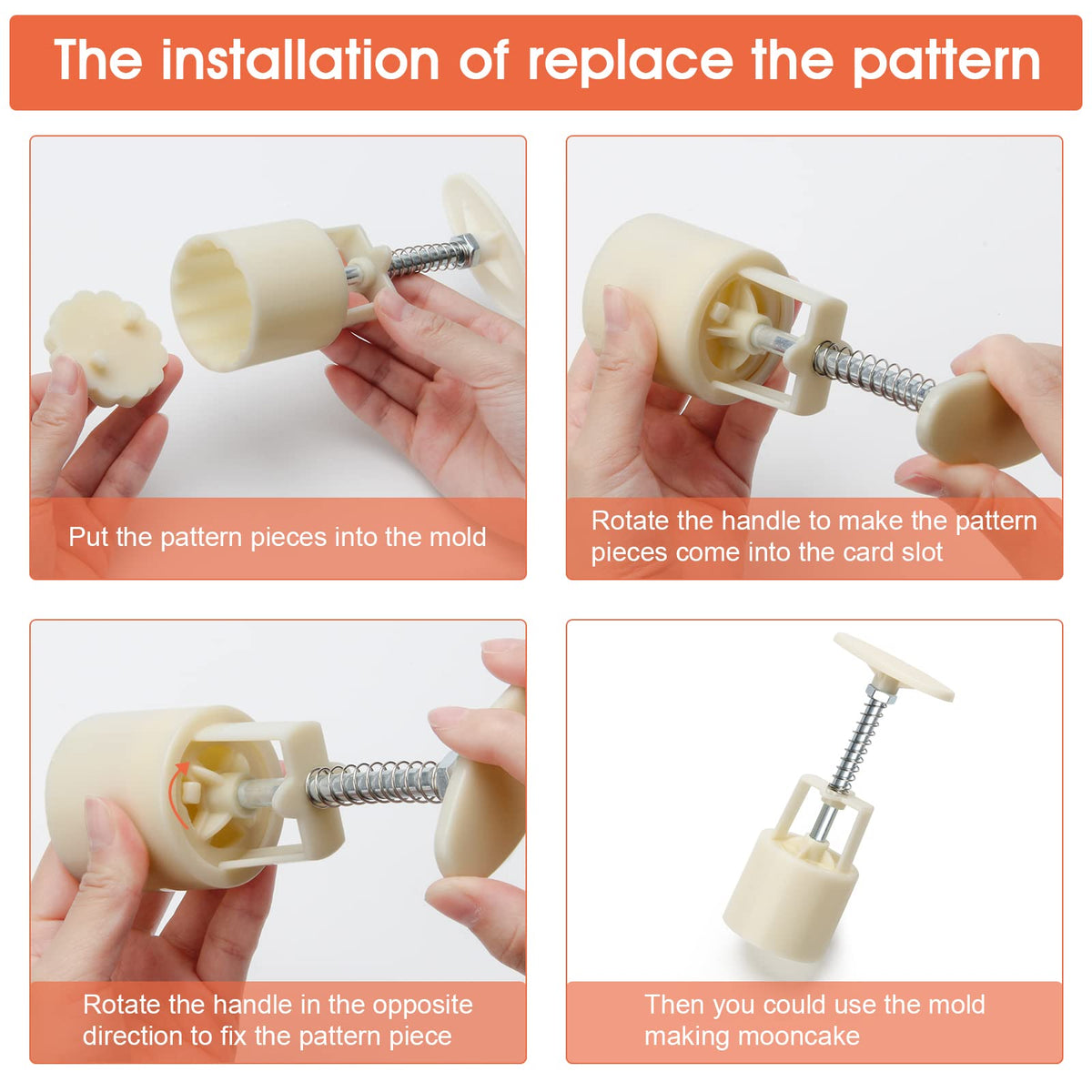 - Q: How do I use the hand-pressure mooncake molds? A: To use the molds, simply press the stainless steel handle to create your desired shape. You can easily replace the pattern piece by turning the handle.