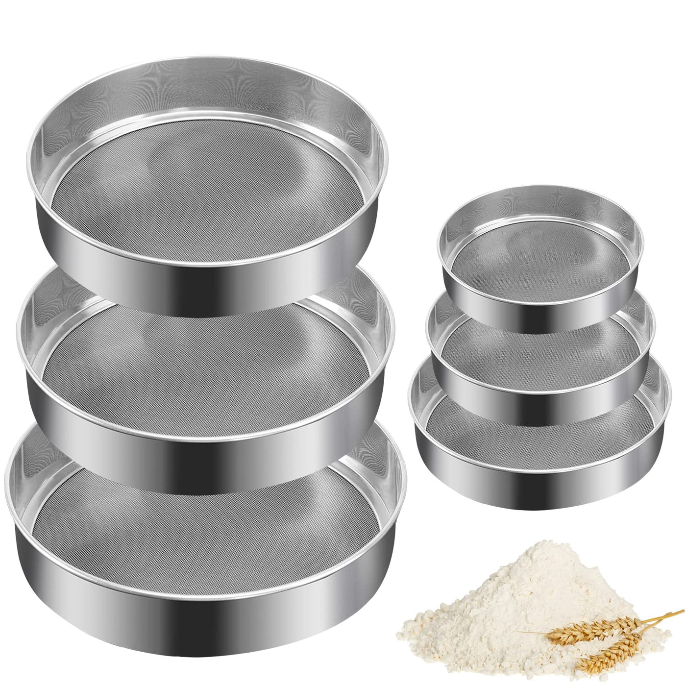 - Q: What sizes are included in the flour sifter set? A: The sizes included are 6 inch, 7 inch, 7.8 inch, 8.6 inch, 9.6 inch, and 11 inch.