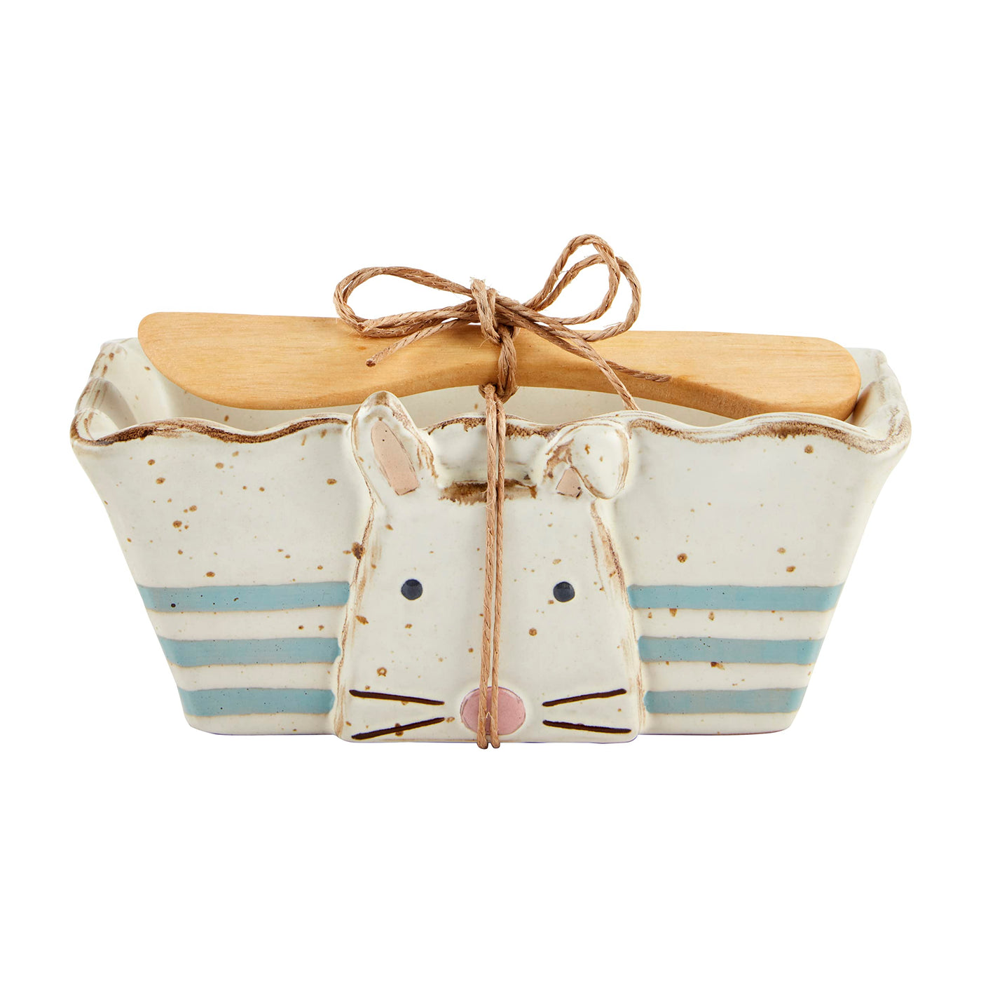• Q: Does the Mud Pie Easter Mini Baker Set come with any additional items? A: Yes, the Mud Pie Easter Mini Baker Set includes a wooden spreader along with the baking dish.
