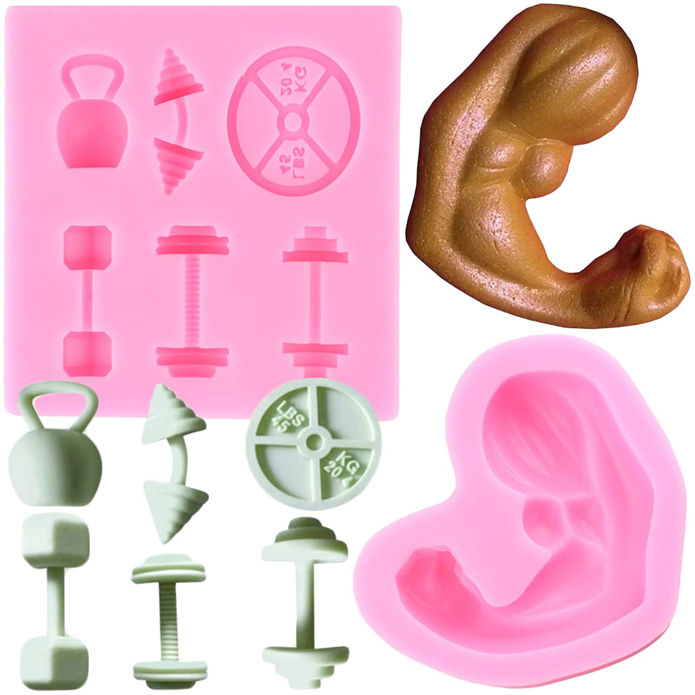- Q: How many molds are included in the set? A: The set includes two molds: one Dumbbell silicone mold and one Muscle silicone mold.