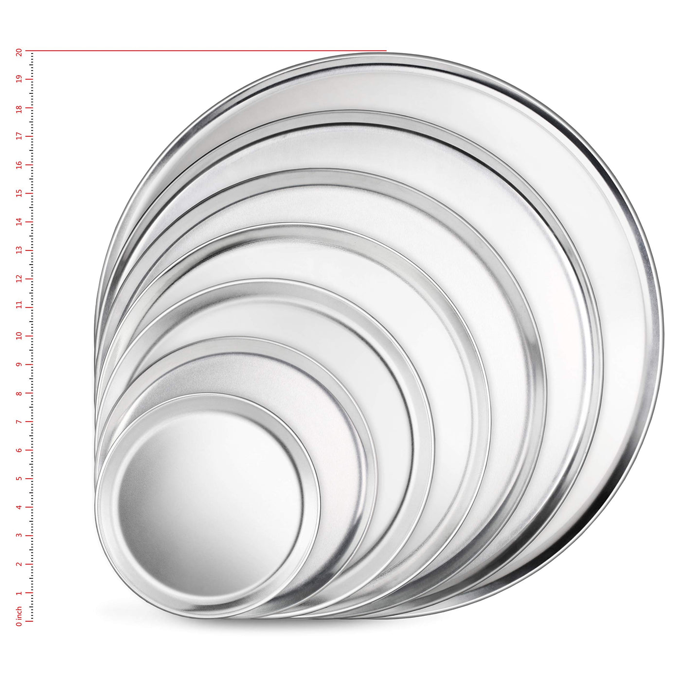 - Q: What size pizzas can I serve on this aluminum pizza pan? A: This aluminum pizza pan is designed for serving pizzas up to 18 inches in diameter.
