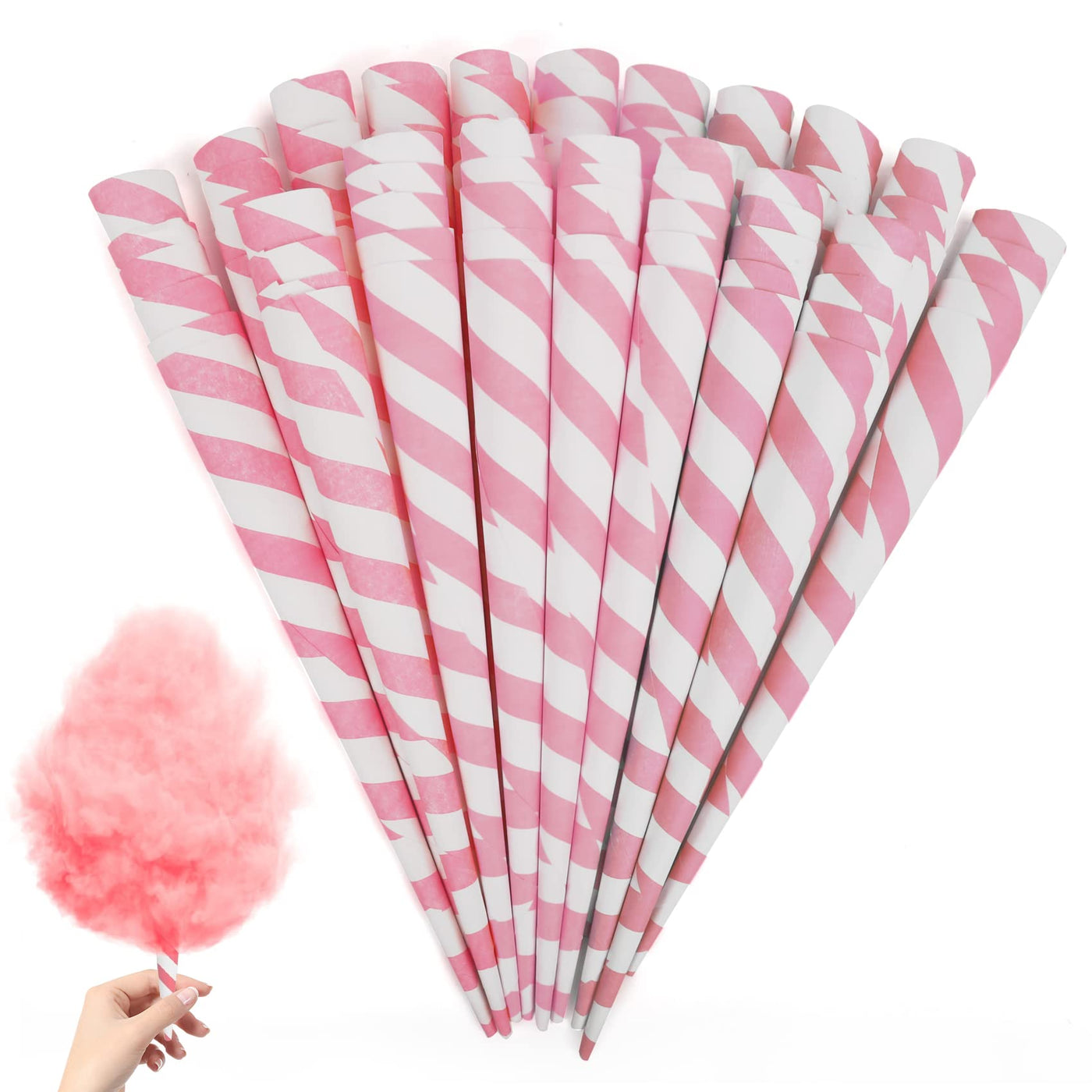- Q: Do the cones come in different colors? A: The cones feature a pink and white striped design, providing a colorful and attractive appearance for cotton candy.