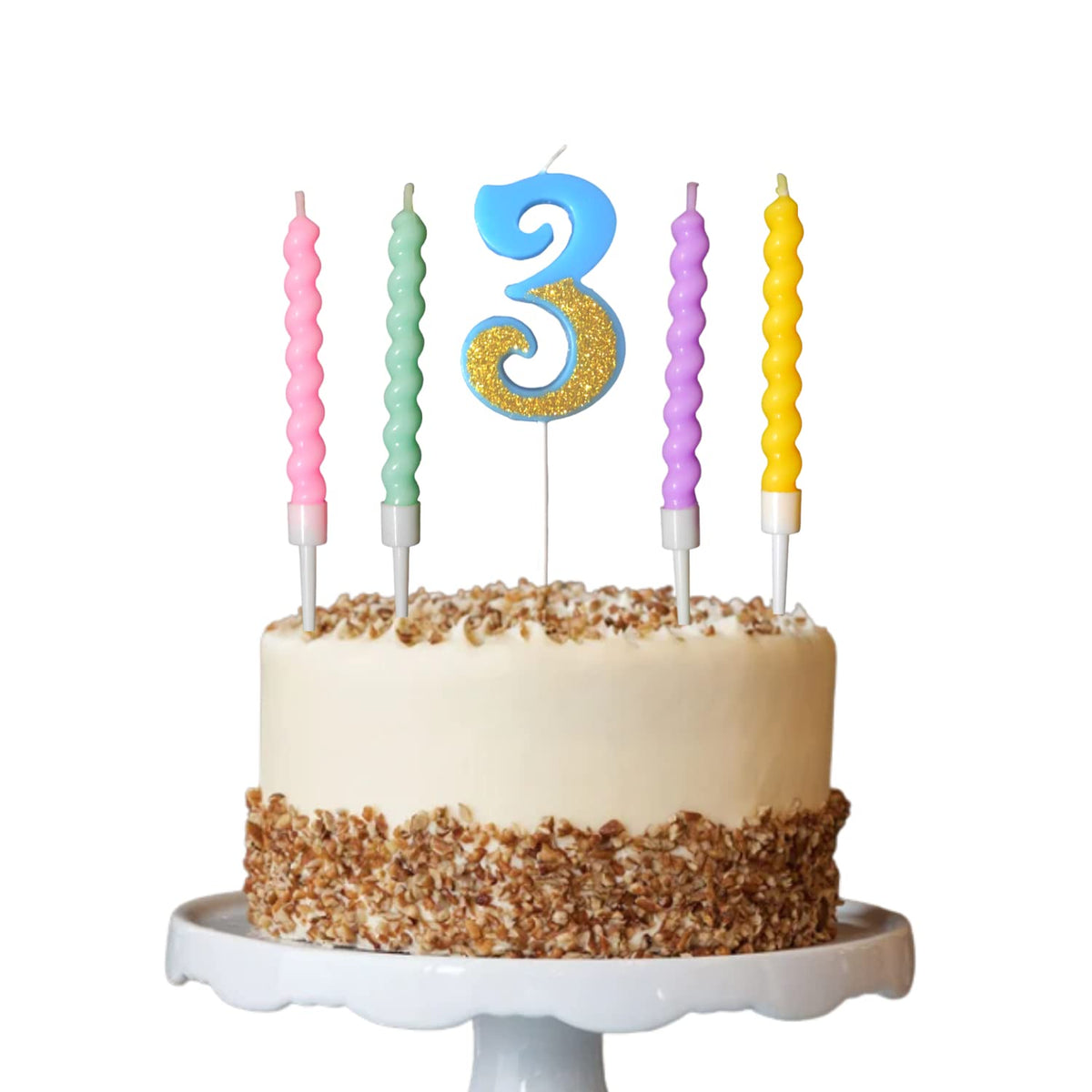 DescriptionParty Decorz Number 3 Candle | Three Number Candle | Three Number Blue Glitter Candle With Pastel Twisted Candle Set Of 5pcs For Birthday ,Anniversary , Surprise Party Cake Decoration Candle