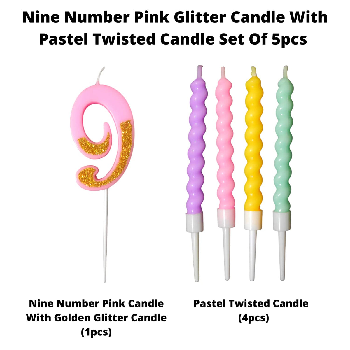 Party Decorz Number 9 Candle | Nine Number Candle | Nine Number Pink Glitter Candle with Pastel Twisted Candle Set of 5pcs for B