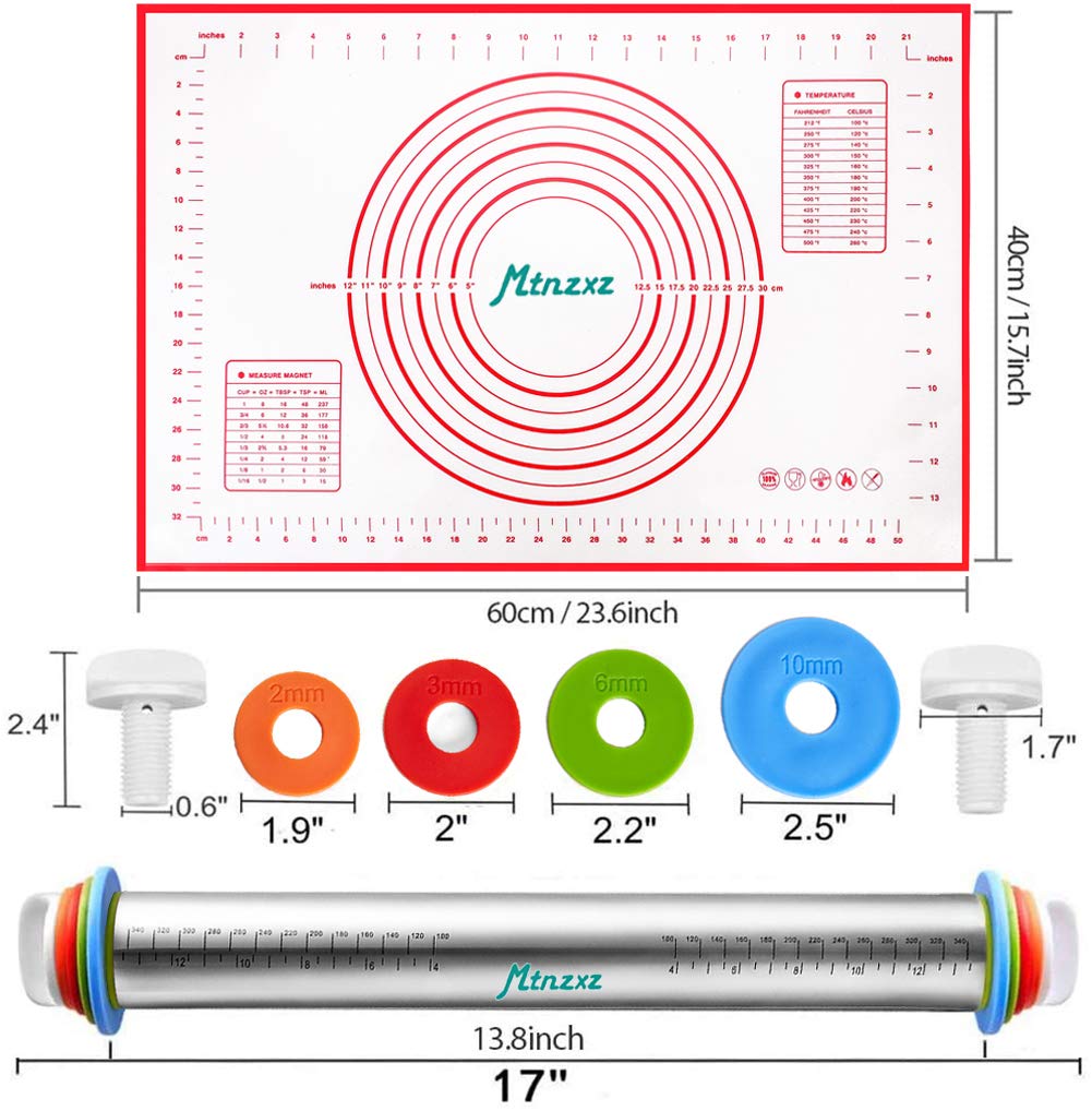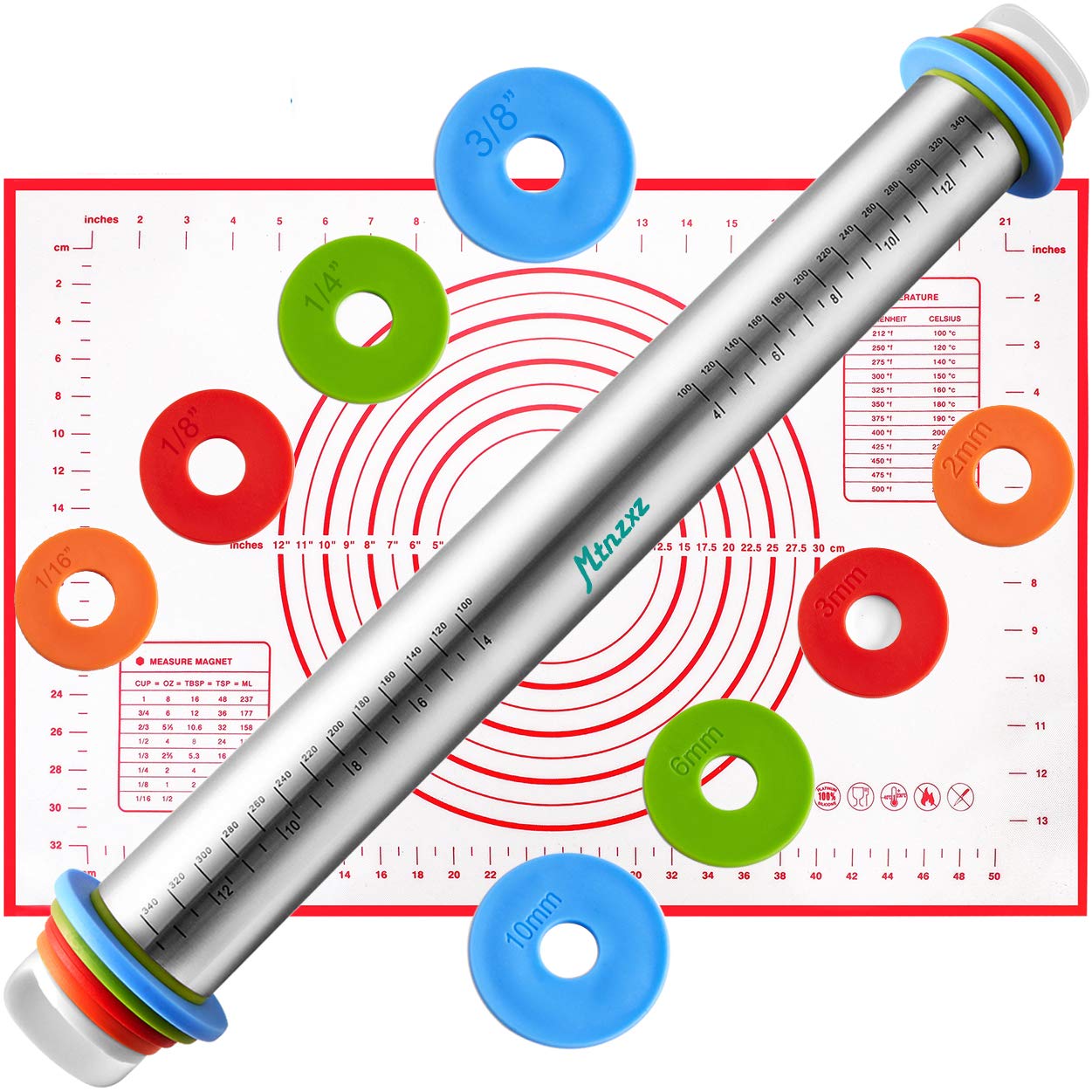 Mtnzxz Rolling Pin And Silicone Baking Pastry Mat - The Kitchen Tool Leading Technology Here On Amazon And In America!100% Satisfaction:Mtnzxz Is The Amazon Registered Brand, Our Has Been Committed To High Quality Product, Best Value In The Market!By Using Mtnzxz Stainless Rolling Pin, You Can Adjust The Thickness Ring To Satisfy Your Dough Thickness.Both A Professional And A Newcomer Should Have A Premium Stainless Rolling Pin To Facilitate The Cooking!In Mtnzxz, We Use The Most High Quality Materials Only For Lifelong Usage. You Will Not Only Save Money But Also Avoid Many Cooking Troubles!!Rolling Pins:- By Using Food-Grade 430 Stainless Steel. High-Grade Satin Brushed Stainless Steel Finish For Long Life.- Its Easier To Roll Cakes, Breads, Cookies And Dough By Using The Product, Making Cooking And Baking So Simple!- Equipped With 1/16, 1/8, 1/4 And 3/8 Inches (2Mm/4Mm/6Mm/10Mm) Removable Rings, It Can Be Easily Rolled To Get Desired Dough Thickness.Pastry Mat:- Measurement: By Using The Accurate Measurement On The Cake Mat Surface, You Can Easily Knead The Dough To Required Size.- Multifunctional: It Can Bake Nearly Everything, Including Cookies, Breads, Cakes, And Candies. And It Can Be Used As A Table Mat Due To Its Large Size.- Multipurpose: You Neednt Worry That Pastry, Cake, Meat Or Soft Sweet Will Stick The Baking Mat. Any Food Can Be Easily Removed From The Mat.- Durable: Temperature Range: -40 To 450?. Package Content:?1 Stainless Steel Adjustable Rolling Pin?1 Silicone Pastry Mat With Measurements And Conversion Tables