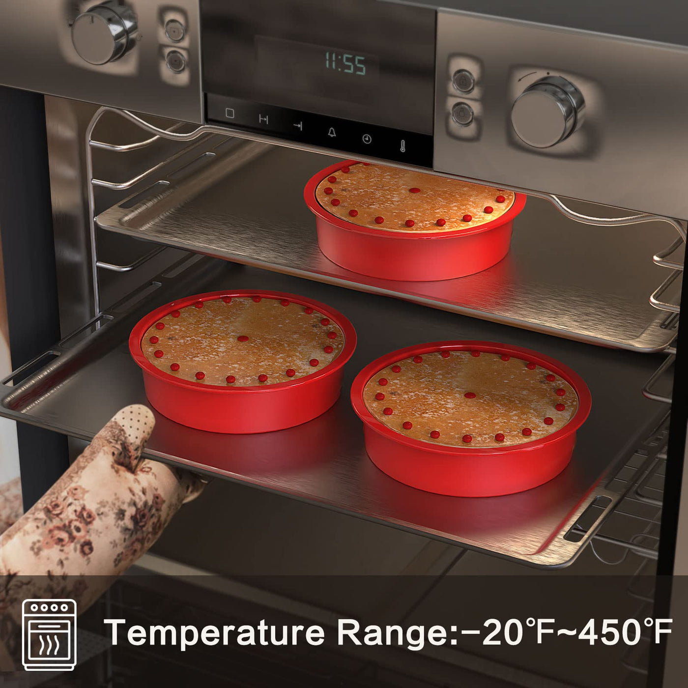• Q: Are these silicone pans safe to use in the oven? A: Yes, the silicone bakeware is safe to use in the oven at temperatures ranging from -20 degrees Fahrenheit to 450 degrees Fahrenheit.