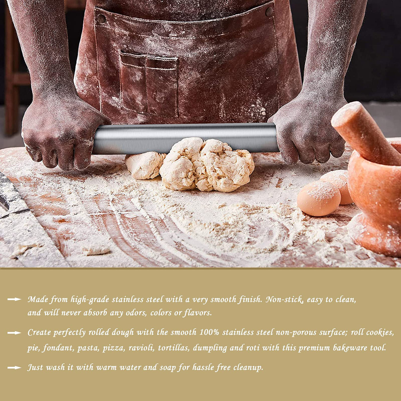 - Q: What makes this rolling pin different from wooden ones? A: Unlike wooden rolling pins, this stainless steel version does not absorb odors, colors, or flavors, and it is resistant to fungus.