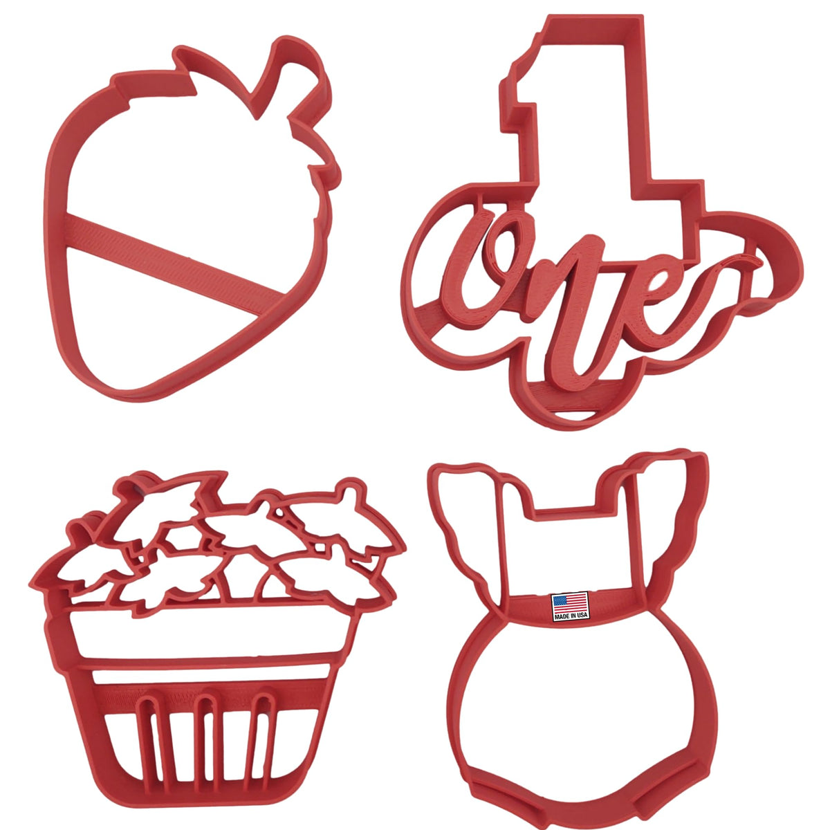- Q: What is included in the Strawberry Cookie Cutter set? A: The set includes four cookie cutters shaped like a strawberry, a romper, the number one, and a quart of strawberries.