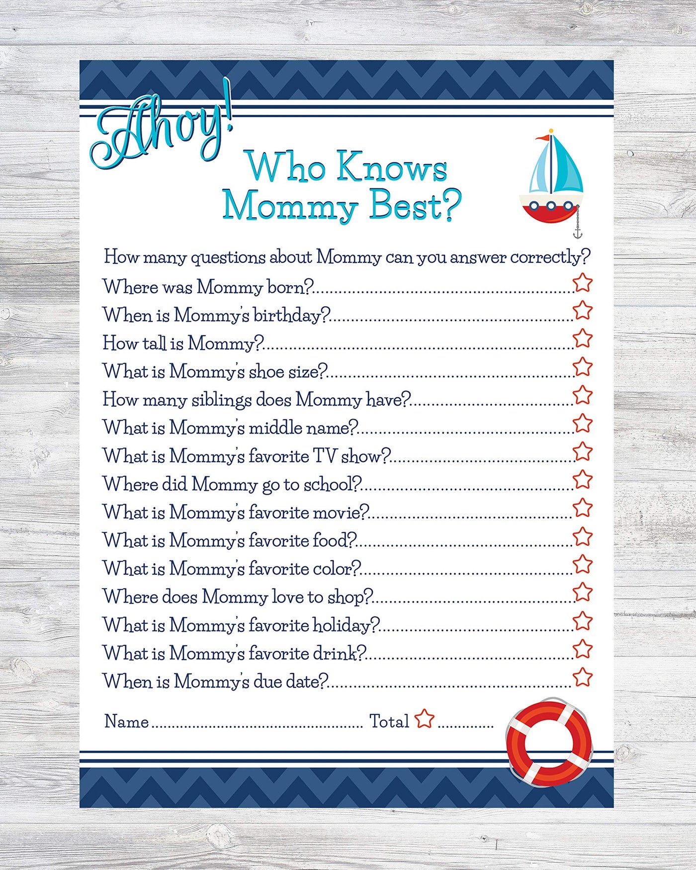 • Q: What is the theme of the Ahoy Nautical Who Knows Mommy Best Baby Shower Game? A: The game has a nautical theme featuring a red, white, and blue color palette, making it perfect for an 'Ahoy it's a boy' baby shower.