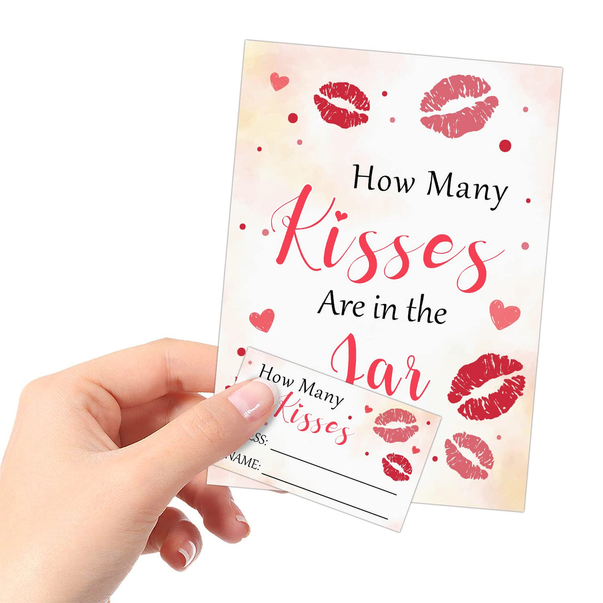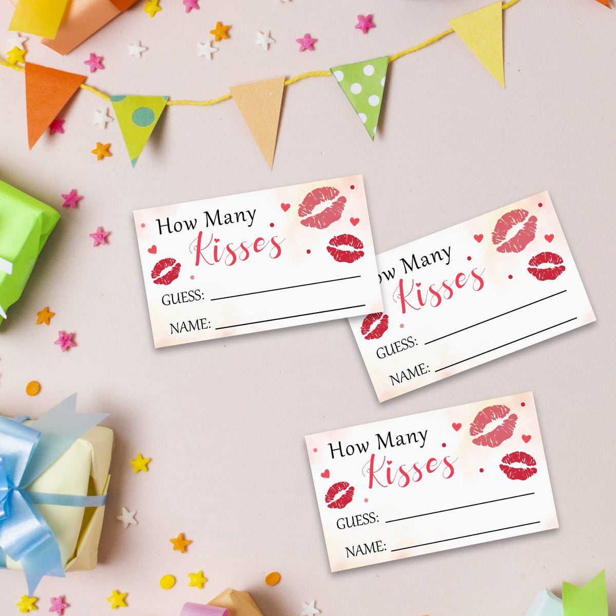 - Q: What is included in the How Many Kisses game kit? A: The kit includes a foldable free-standing sign and 50 guessing cards, providing enough materials for various gatherings.
