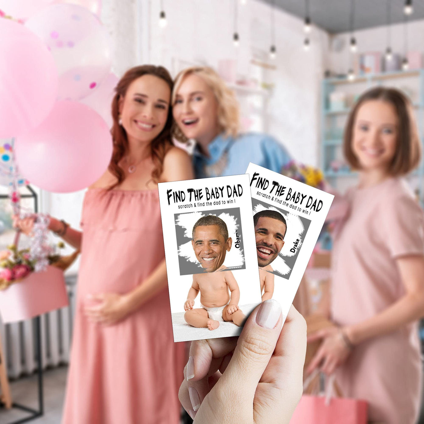 - Q: How do you play the Find the Baby Dad game? A: To play, print the TRUE Dad’s image, cut it into a 1-inch circle, and stick it onto a blank card. Cover the images with scratch-off stickers and distribute the cards to guests.