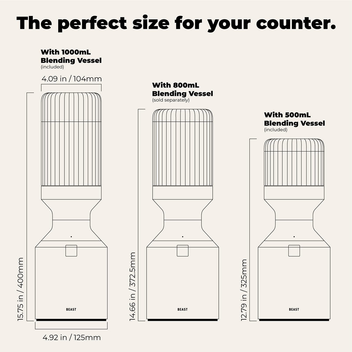 - Q: What type of design does the Beast Blender have? A: The Beast Blender has a premium kitchen countertop design in a sleek Cloud White finish, making it an attractive addition to your kitchen.