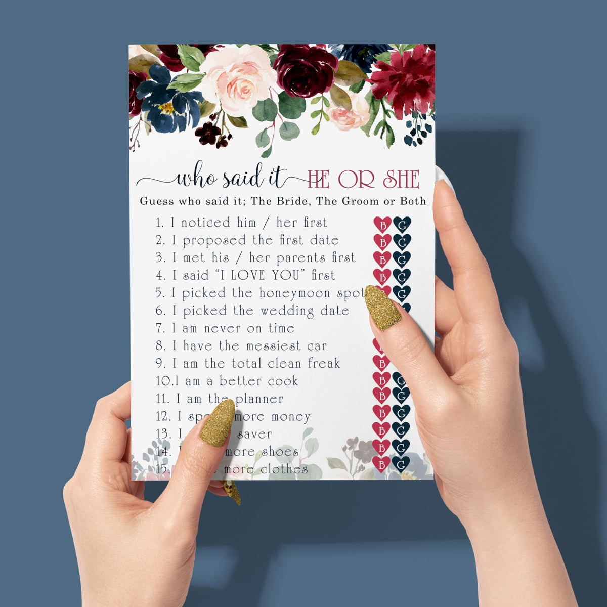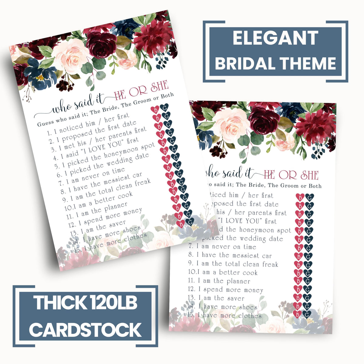 - Q: Can I use these games for a themed bridal shower? A: Absolutely! The rustic burgundy and blue floral design can complement various themes, adding a fun and interactive element to your bridal shower.