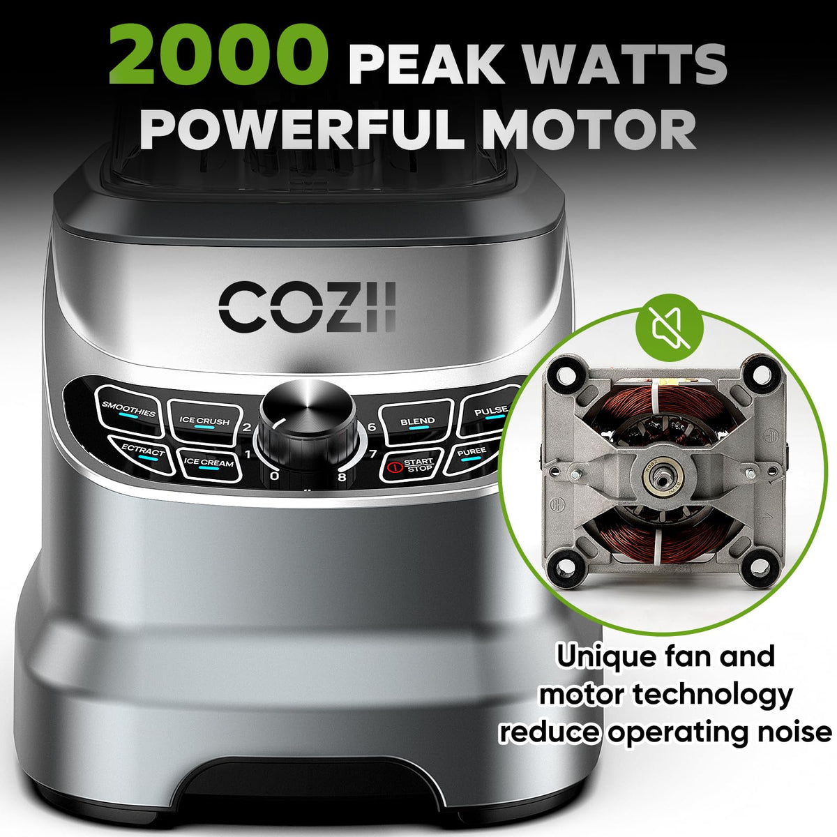 - Q: What is the power of the COZII Professional Blender? A: The COZII Professional Blender features a powerful 2000 Peak Watt industrial-grade motor, which allows it to efficiently blend and crush ice into snow in seconds.