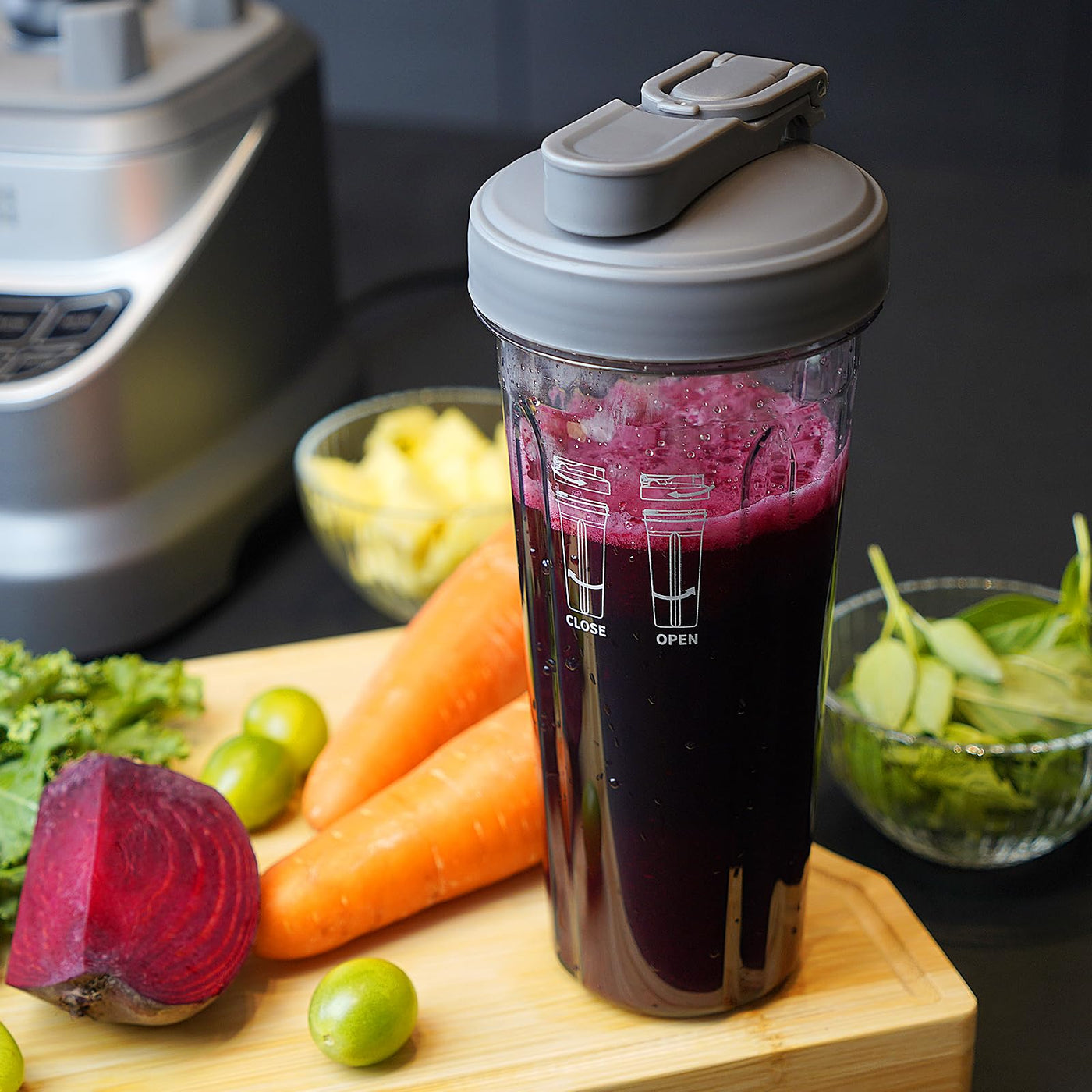 - Q: What is the capacity of the blender pitcher and to-go cup? A: The blender features a large 64-oz pitcher and a convenient 21-oz to-go cup for easy transport of your blended beverages.