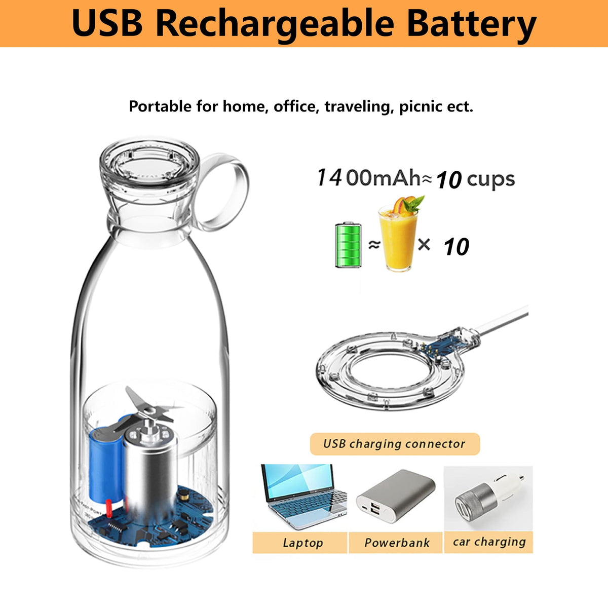 Otpeir Personal Size Blender, Portable Blender, Battery Powered Usb Blender (Black)