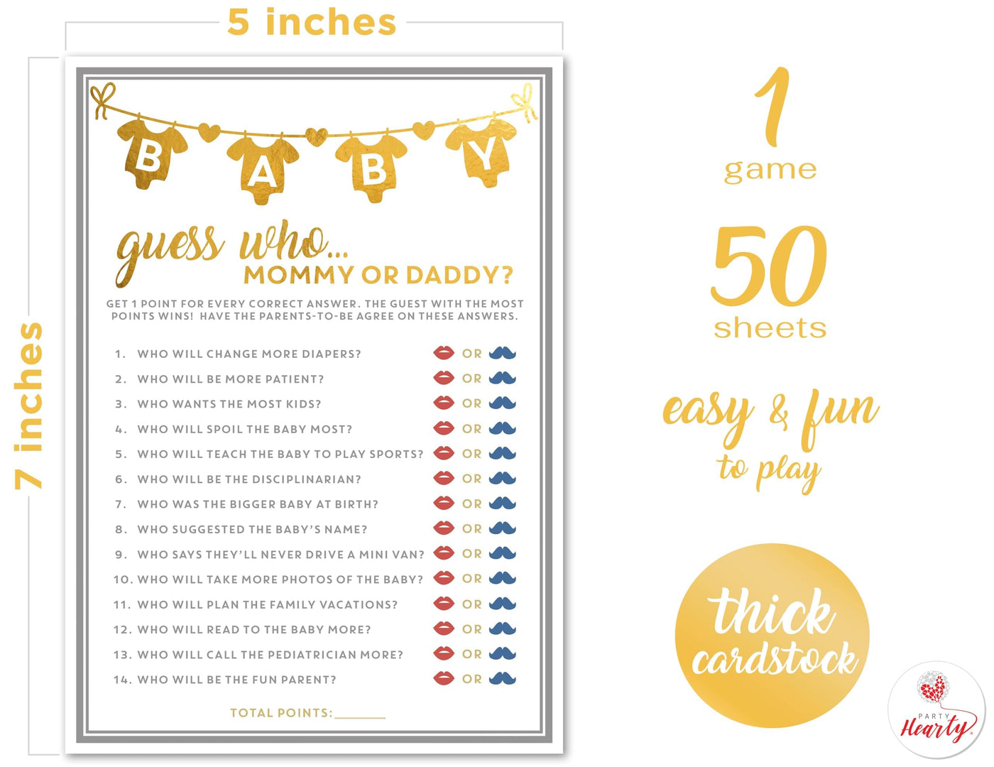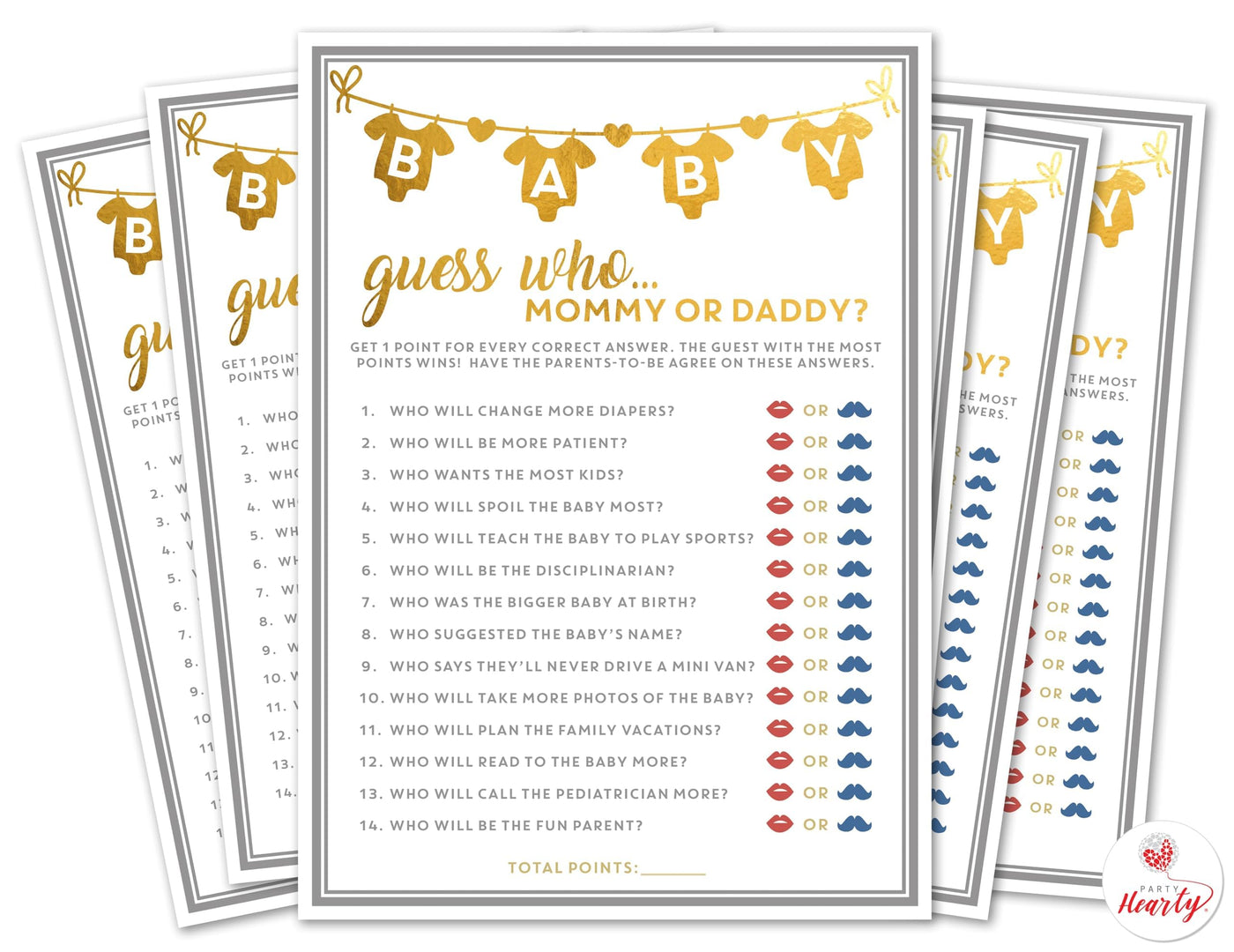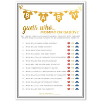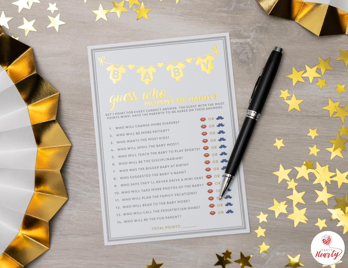 - Q: What types of games are included in the Party Hearty Baby Shower Games kit? A: The kit includes 50 cards for the 'Guess Who Mommy or Daddy' game, designed to be fun and engaging for both boys and girls.