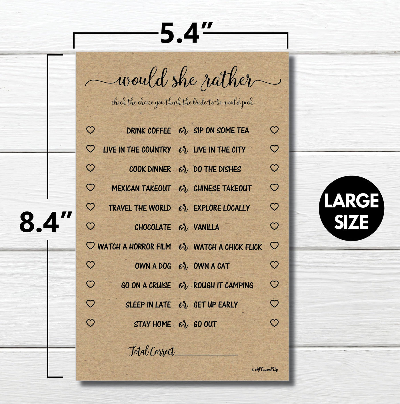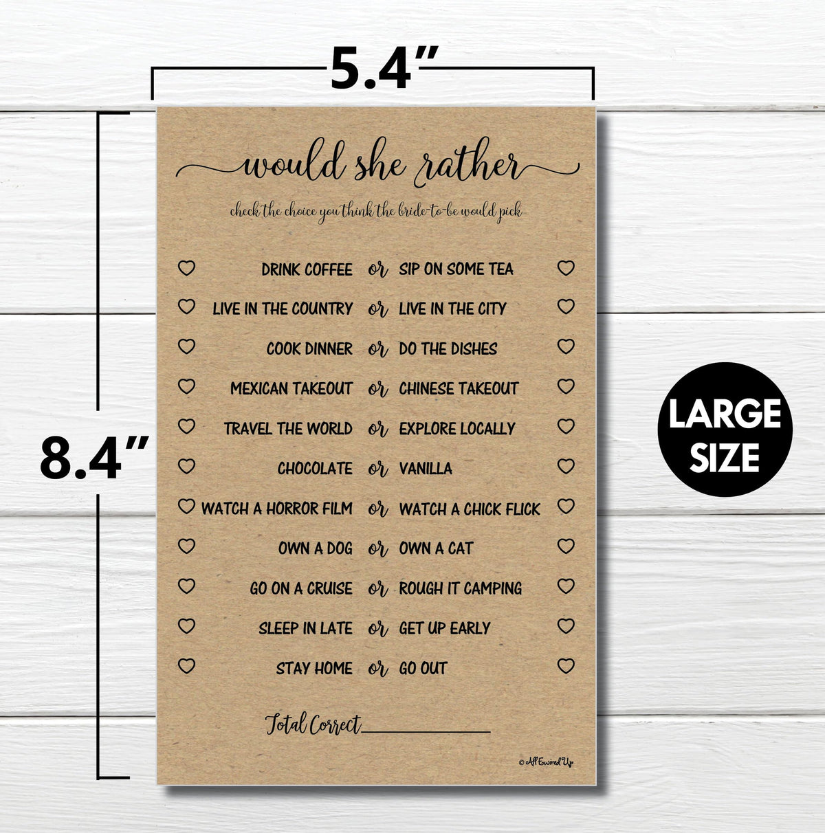 Would She Rather Game - Kraft (50-Sheets) Rustic Bridal Wedding Shower Or Bachelorette Party Game, Printed Engagement Rehearsal