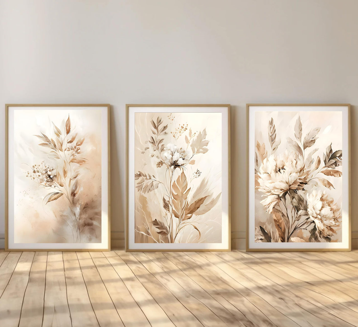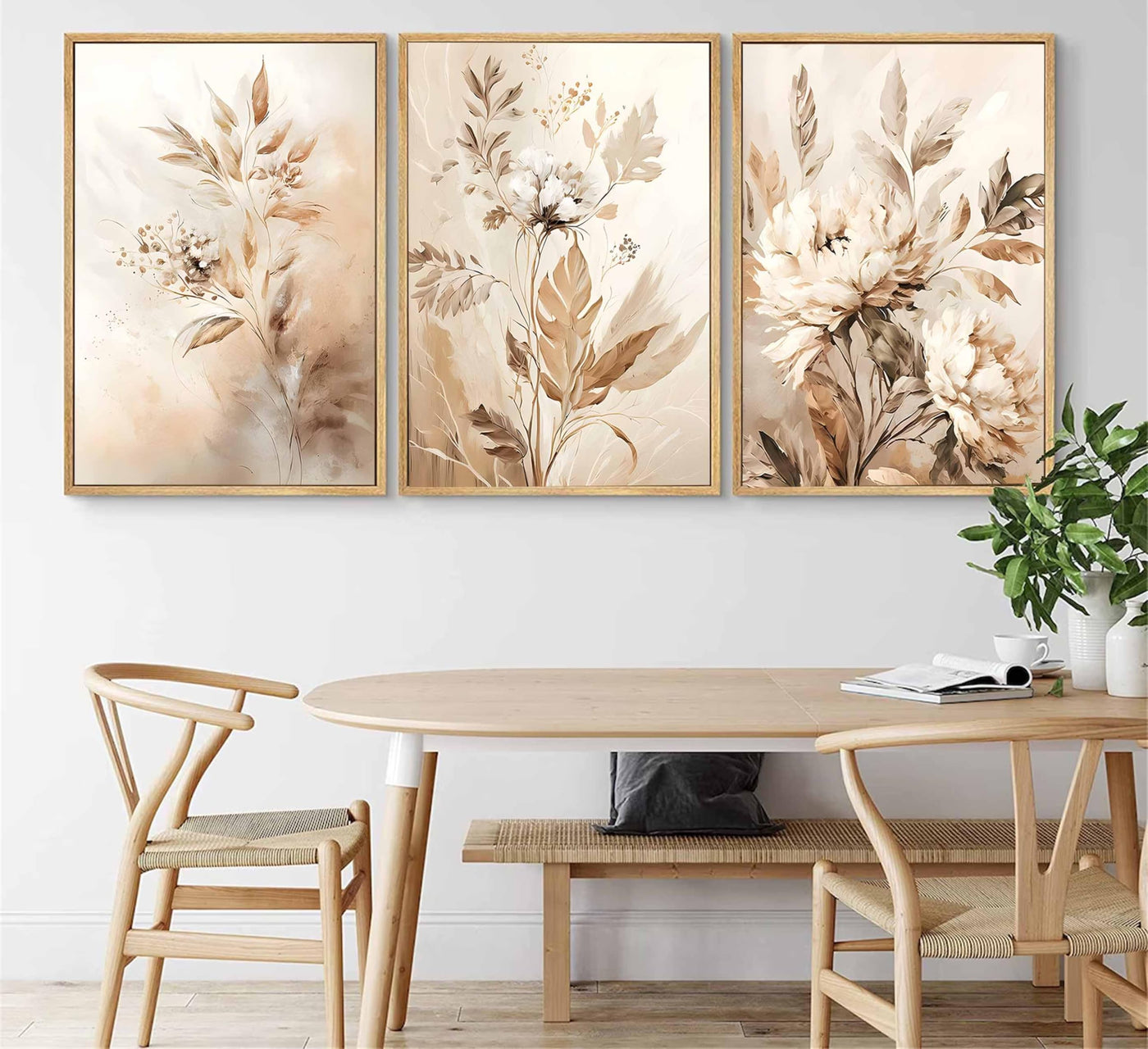 3 Pcs Beige Neutral Flower Canvas Wall Art Wildflowers Floral Botanical Painting Picture Wall Decor Poster Print Artwork For Bed