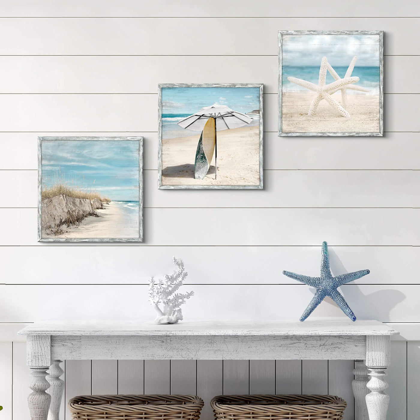 Beach Pictures Wooden Wall Art: Ocean Artwork Home Decor Set Of 3 Seascape Pathway Surfboard Starfish Collection Prints For Bedr