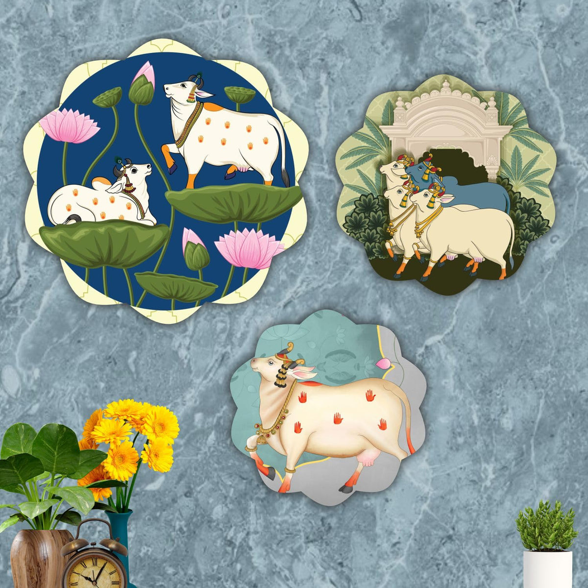 Bhikham Creations Set Of 3 Cow Pichwai Designer Art Beautiful Round Shape Wall Hanging Decor | Wall Decoration Accessories For H