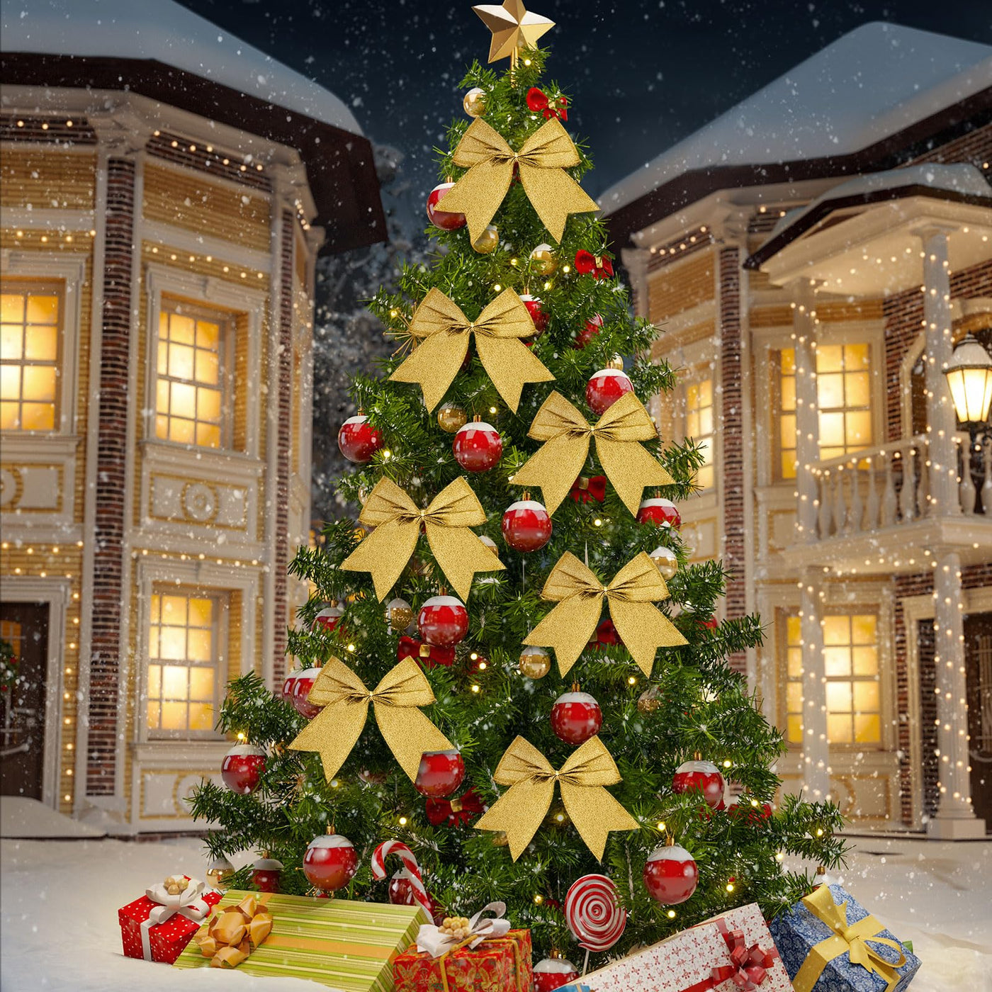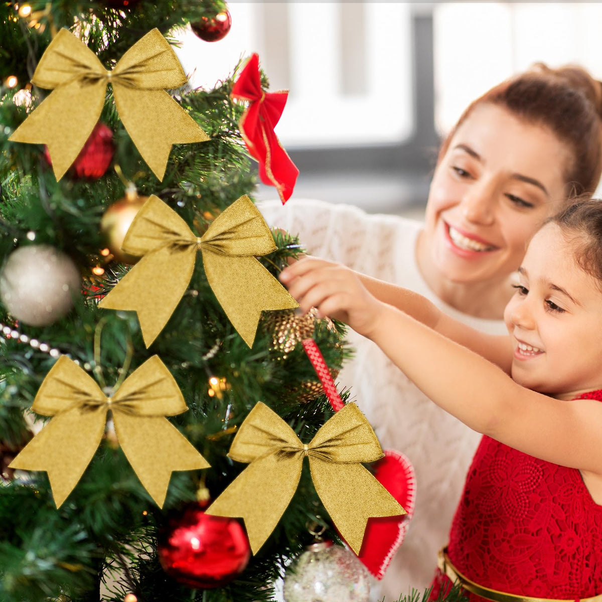 Cindeer 24 Pcs Gold Christmas Bow Decorations 6 Inch, Glitter Holiday Bows with Sequin Ties for Xmas Tree, Halloween, Wreath, DI