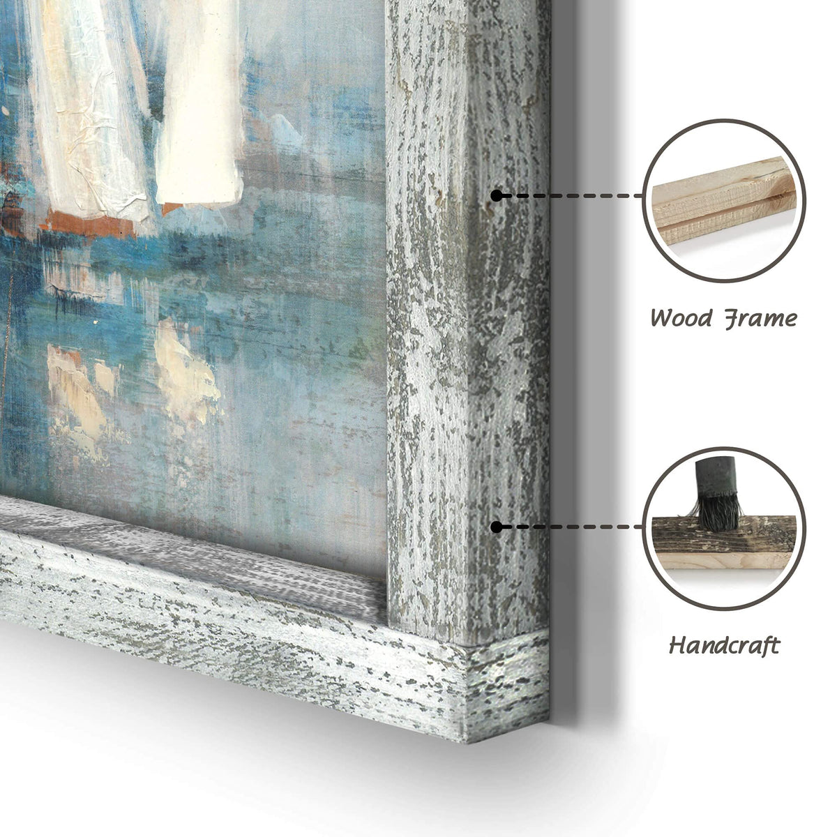 Coastal Framed Painting Wall Art: Abstract Ocean Artwork Seascape Picture Sailboat Prints On Wood In Modern Style For Bedroom 32
