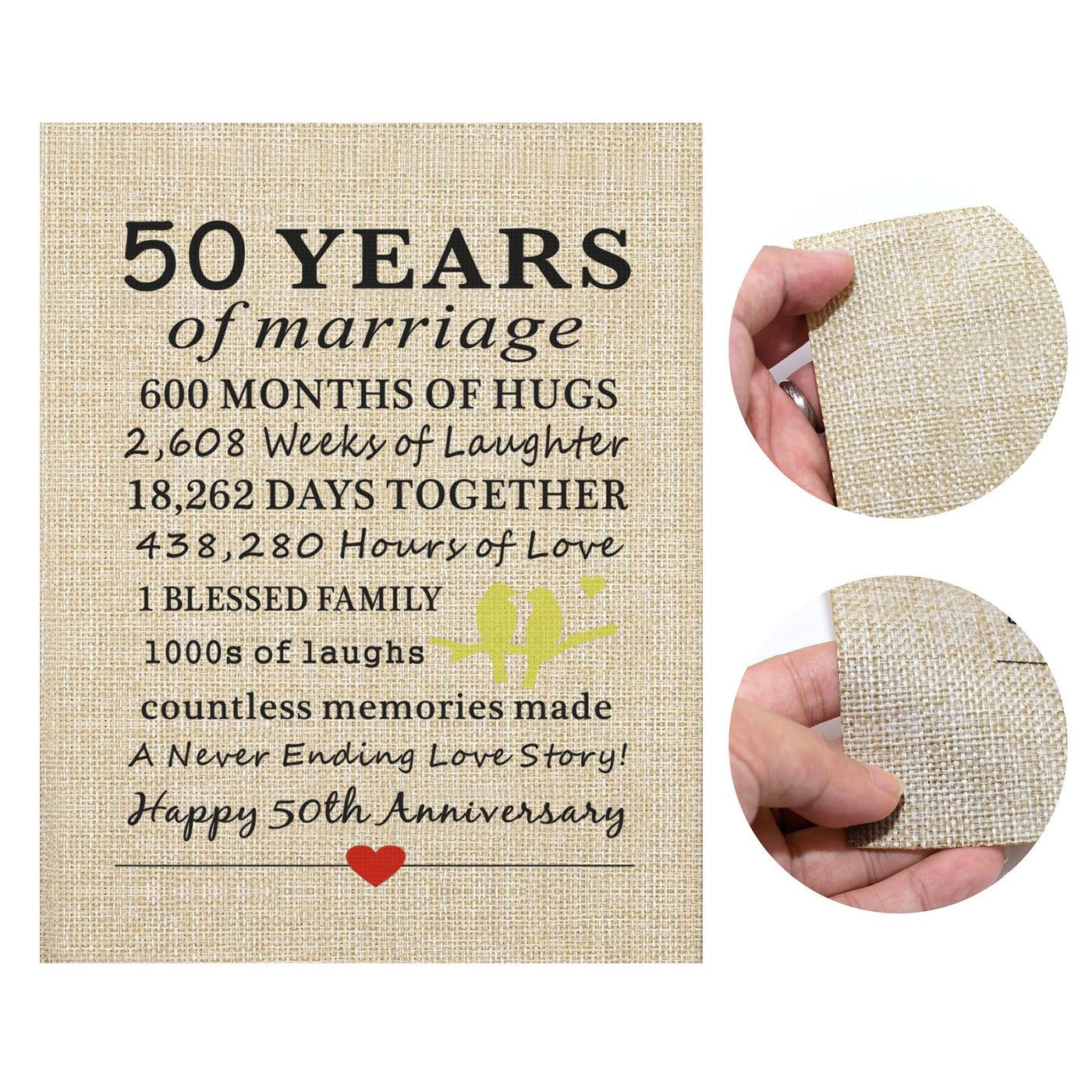 • Q: Can this print be customized? A: This particular burlap print is not customizable, as it comes with a pre-designed text celebrating the 50th anniversary.