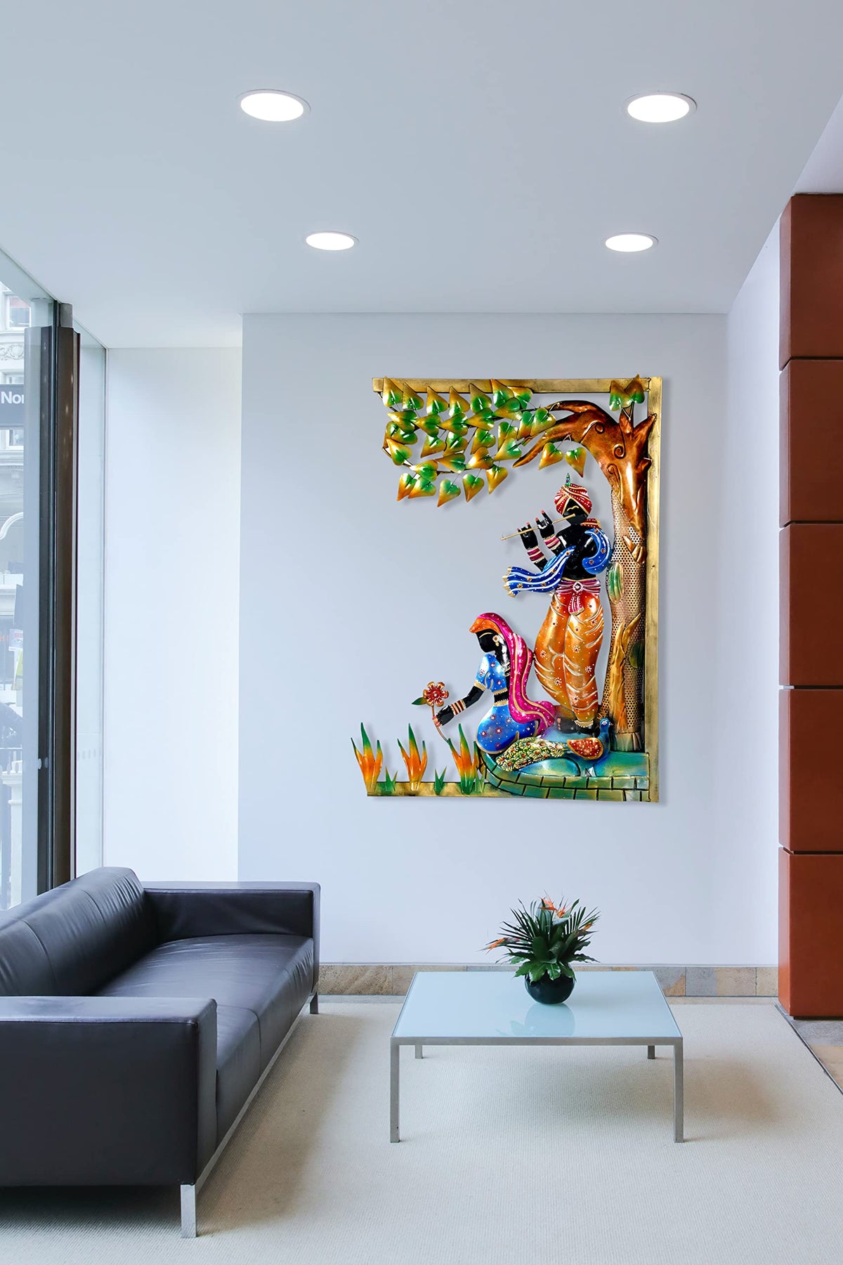 Craftbee Radhe Krishna Metal Emboss Painting God Large Wall Hanging Tree Frame Sculpture | For Home Decor & Office Gift Wall Fig