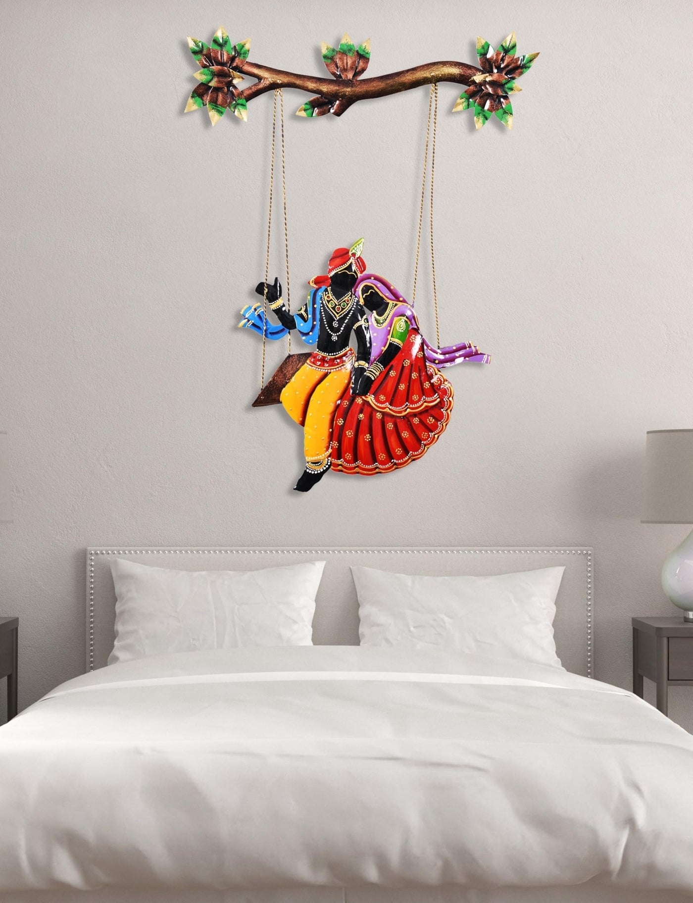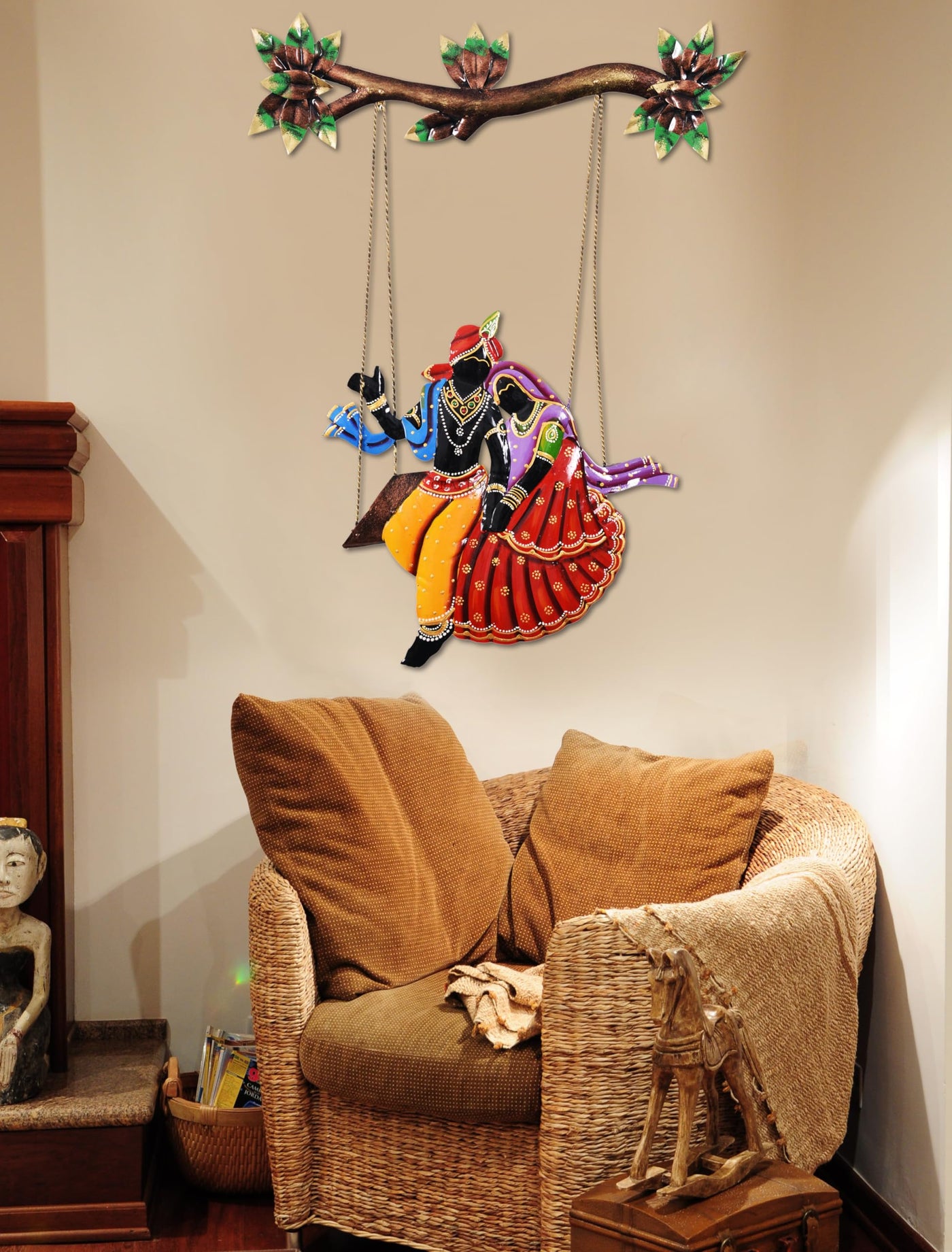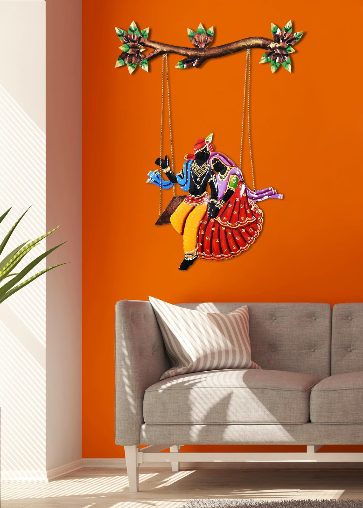 Craftowl Iron Radha Krishna Sitting On Jhula Wall Hanging | Rajasthani Wall Sculpture Figurine For Gift, Home Decor, Living Room