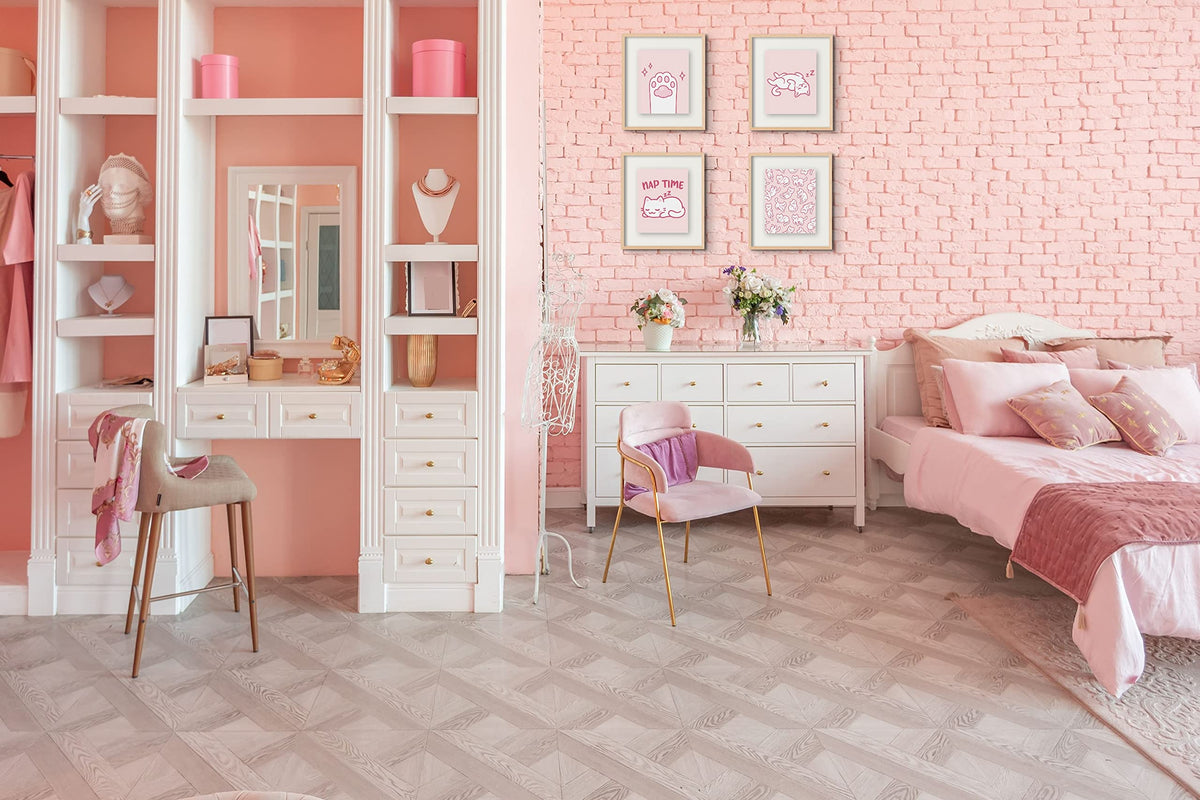 Crystal Canvas Prints Pink Cat Prints - Set Of 4 (8X10) Inches Glossy Kawaii Kitten Paw Beans Cute Minimalist Pastel Blush Carto
